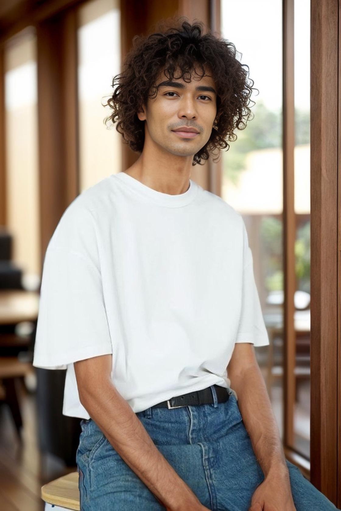 A Man In A White T-Shirt And Jeans Sits Casually On A Stool In A Modern Sunlit Room