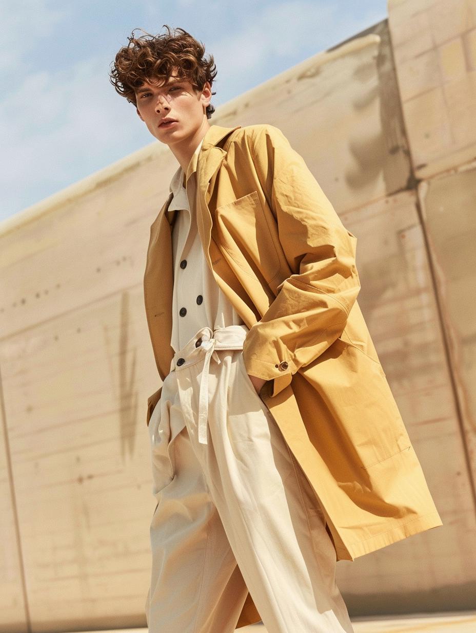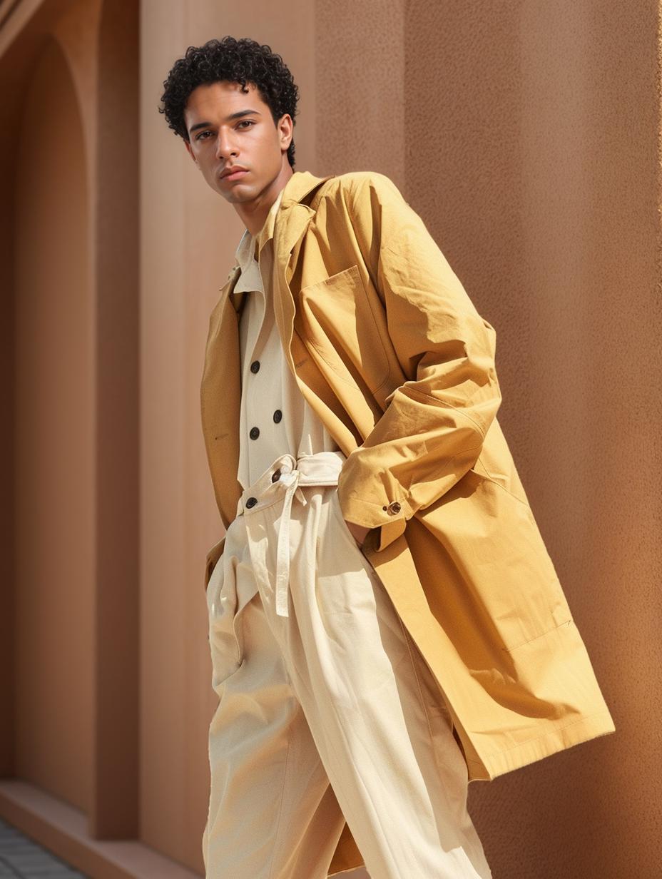 A Man In Stylish Beige And Yellow Clothing Stands Confidently Against A Textured Wall In An Outdoor Setting