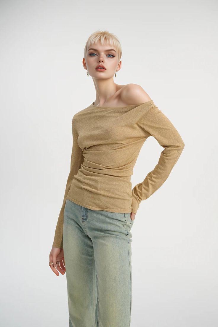 A Person In A Chic Off-Shoulder Top And Jeans Poses In A Modern Room With Wood Paneling And A Flat-Screen TV