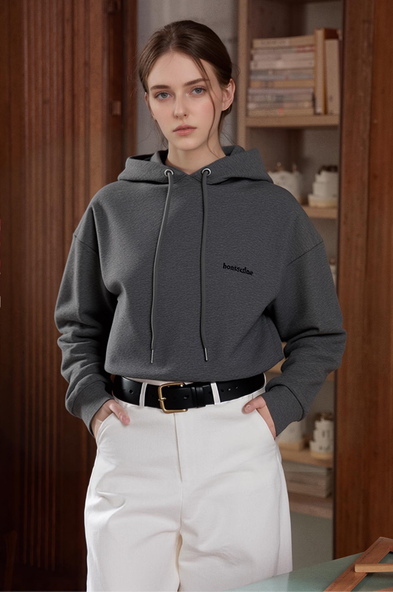 A Person Stands Confidently In A Casual Grey Hoodie And White Pants Posing In An Interior Setting With Wooden Elements And Bookshelves In The Background