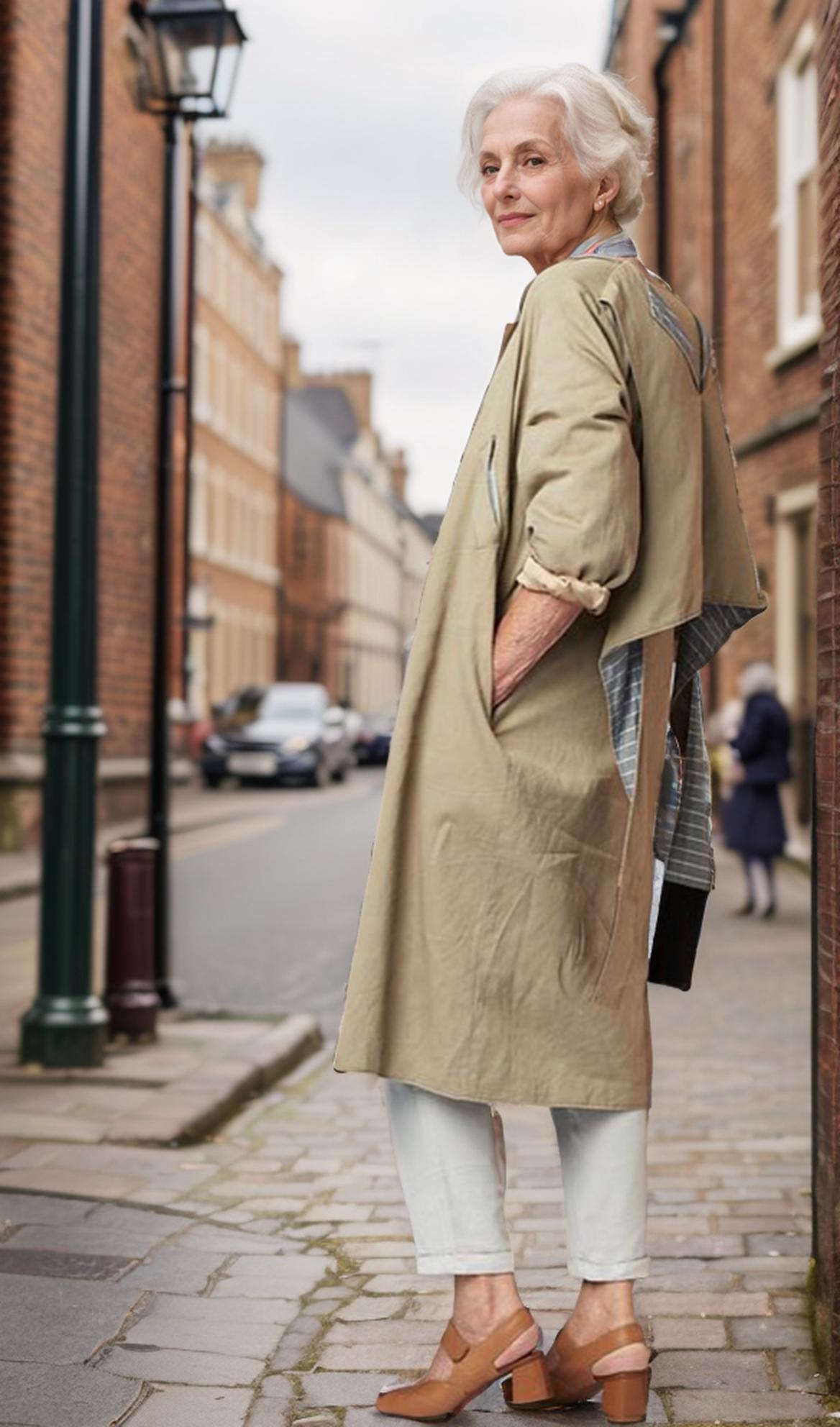 A Stylish Woman In A Beige Coat And Heeled Shoes Stands On A Cobblestone Street In A Quaint Urban Setting