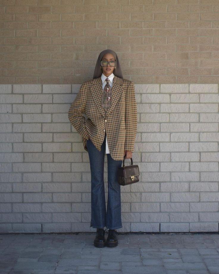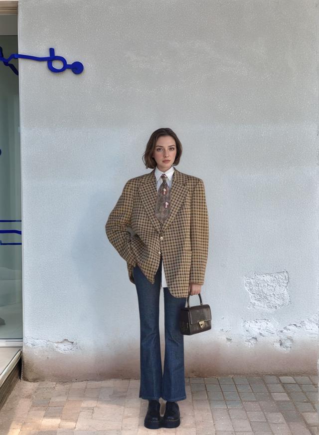 A Stylish Woman Poses Against A Modern Urban Wall Showcasing A Vintage-Inspired Outfit