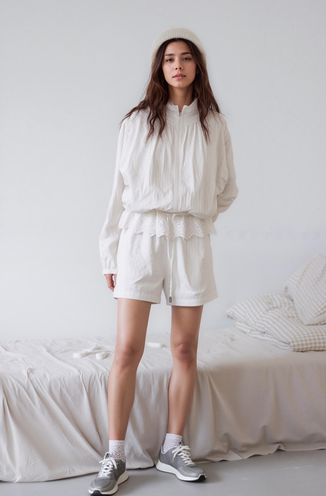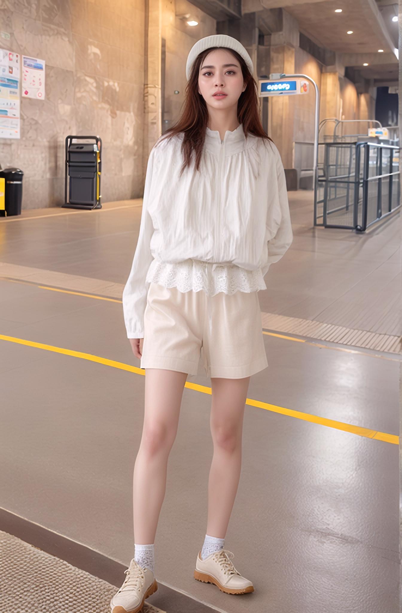A Woman Dressed In A Chic White Outfit Stands Confidently In A Modern Subway Station