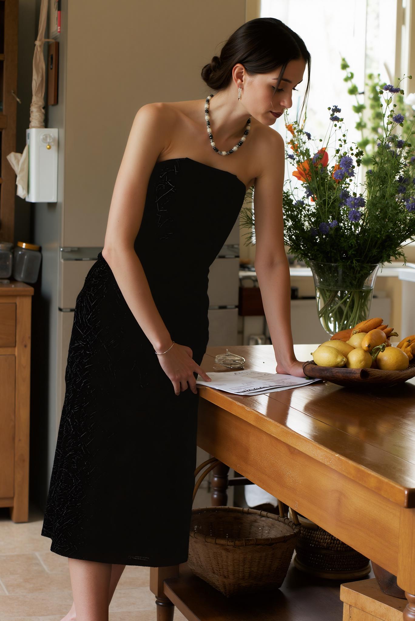 A Woman In A Black Dress Leans On A Wooden Table In A Cozy Kitchen Setting Adorned With A Vase Of Fresh Flowers And A Bowl Of Fruit