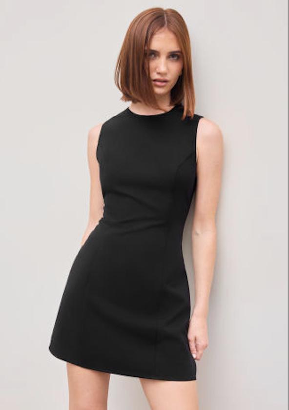 A Woman In A Black Dress Stands Confidently In Front Of Grand Architectural Columns