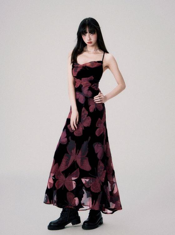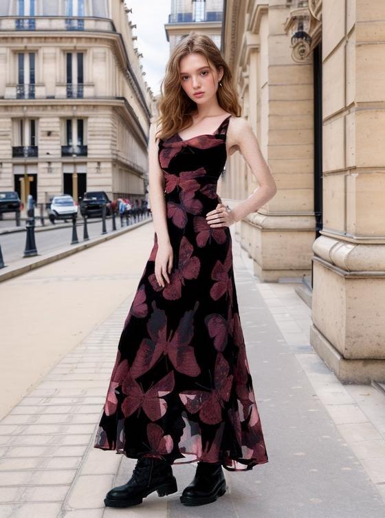 A Woman In A Butterfly-Patterned Dress Stands Confidently On A Stylish Urban Street With Classic Architecture In The Background