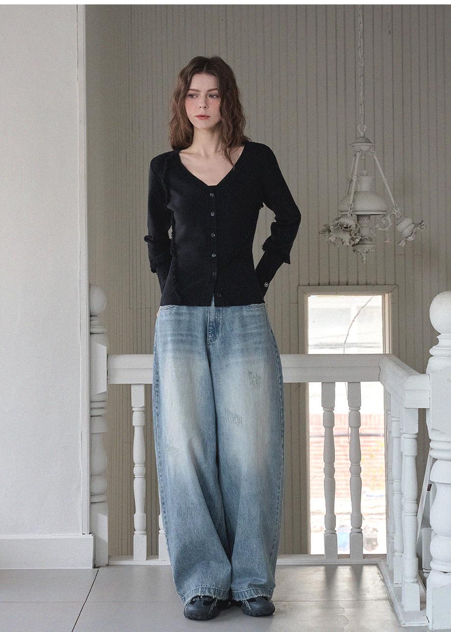 A Woman In A Chic Navy Blue Top Paired With Light-Wash Denim Jeans Poised Against A Simple White Background