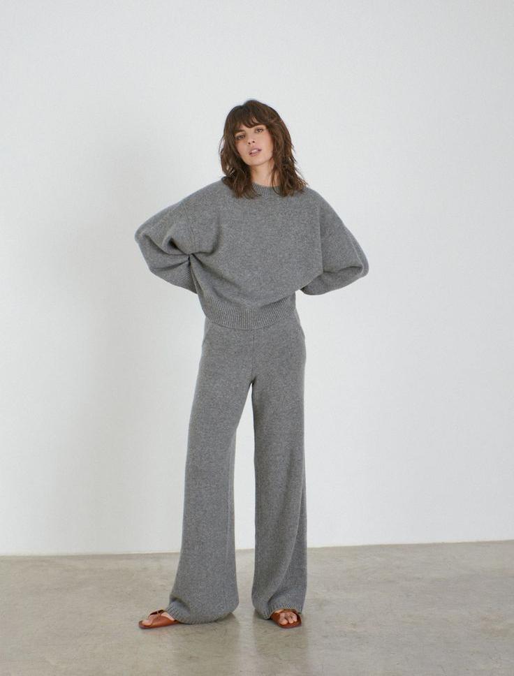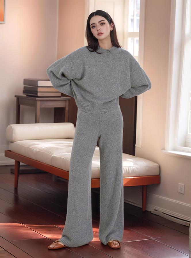 A Woman In A Cozy Grey Knit Outfit Stands Confidently In A Stylish Sunlit Living Room