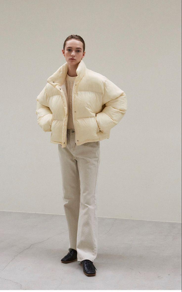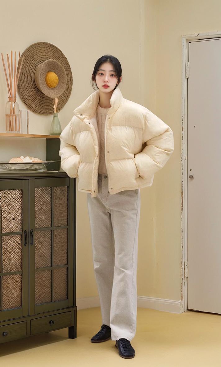 A Woman In A Cozy White Puffer Jacket And Casual Jeans Stands In A Warmly Decorated Room With A Green Cabinet And Wall-Mounted Hat