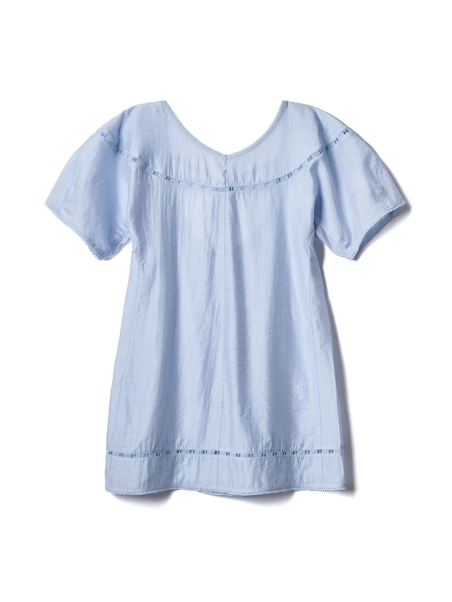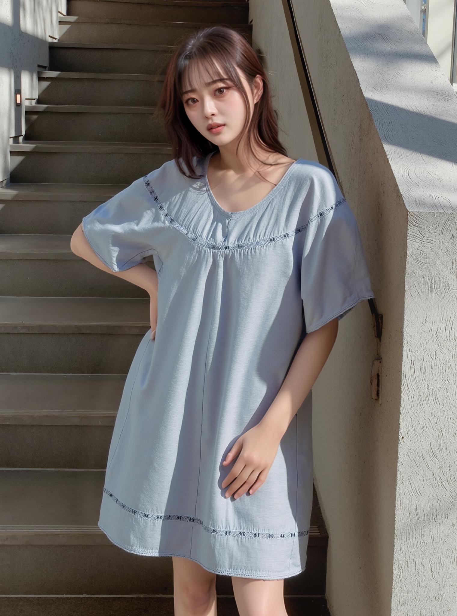 A Woman In A Light Blue Dress Stands On Sunlit Stairs Creating A Relaxed Summer Vibe