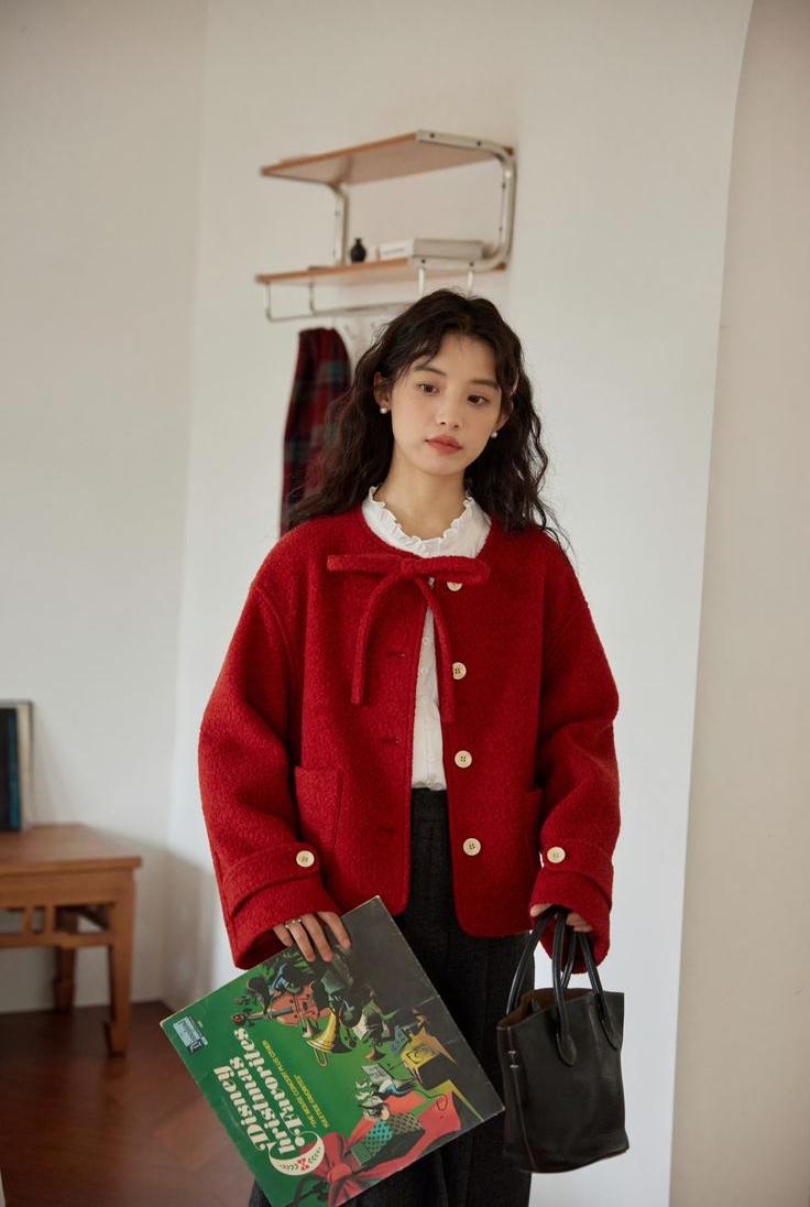 A Woman In A Red Coat Stands In A Modern Well-Lit Room Holding A Book And A Black Handbag