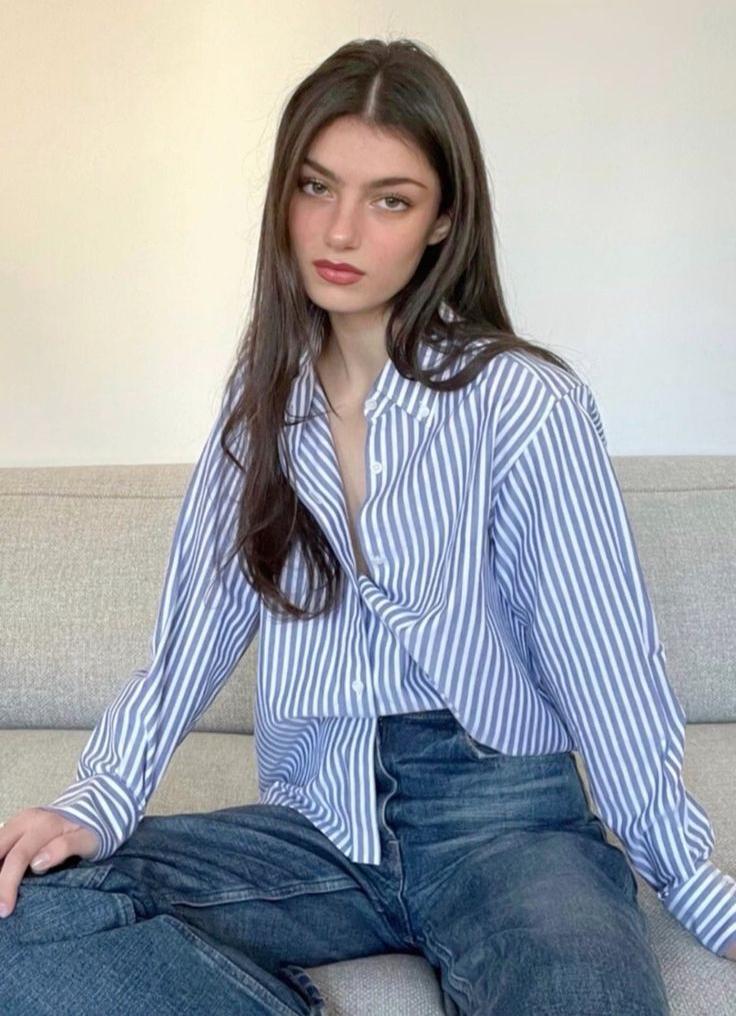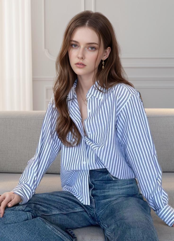 A Woman In A Striped Shirt And Jeans Sits Casually On A Sofa In A Modern Well-Lit Room