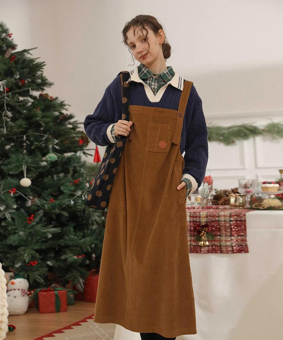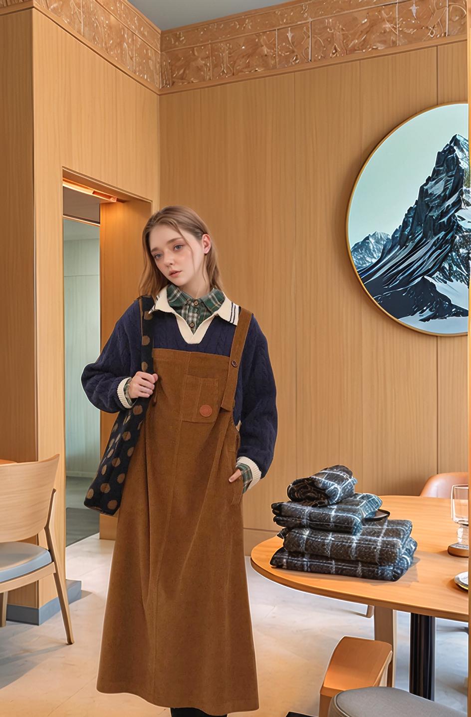 A Woman In A Stylish Brown Overall Dress Stands In A Cozy Warmly-Lit Room Adorned With Wooden Walls And A Mountain Artwork