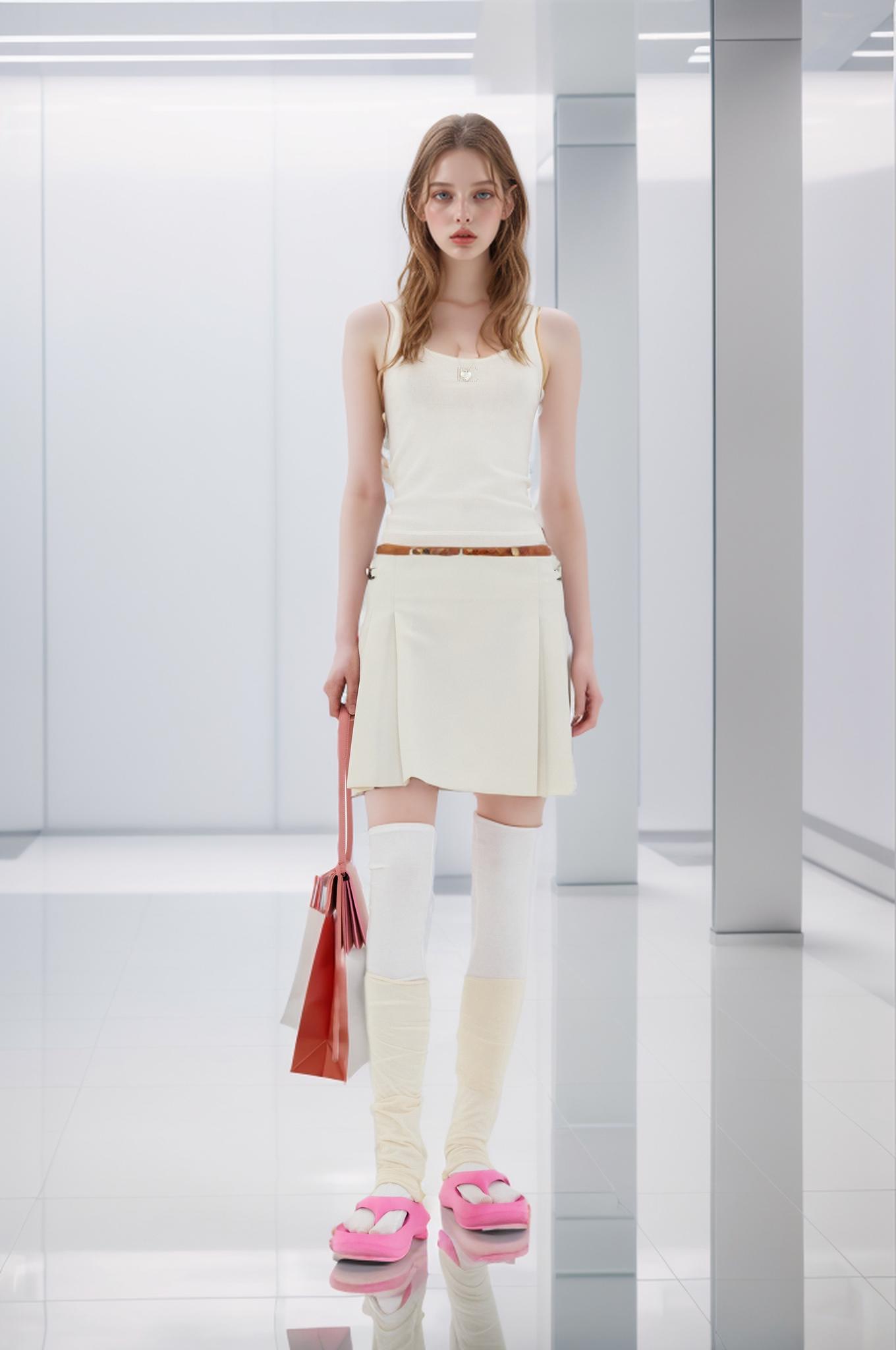 A Woman In A Stylish White Outfit And Pink Sandals Stands In A Modern Minimalistic Setting