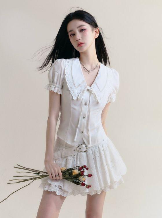 A Woman In A White Dress Holds A Bouquet Of Flowers While Standing In A Garden