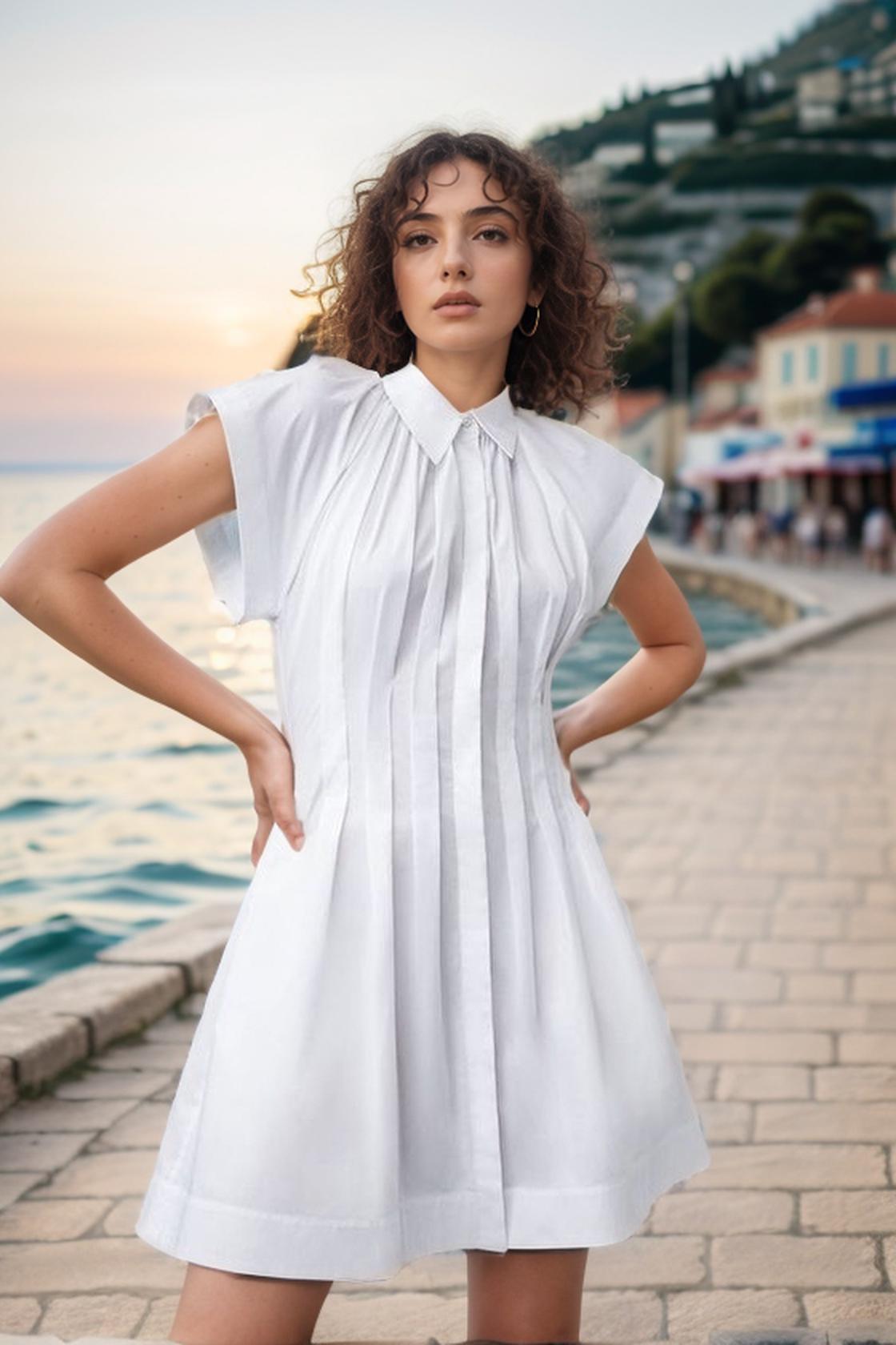 A Woman In A White Dress Poses On A Picturesque Waterfront Promenade During Sunset