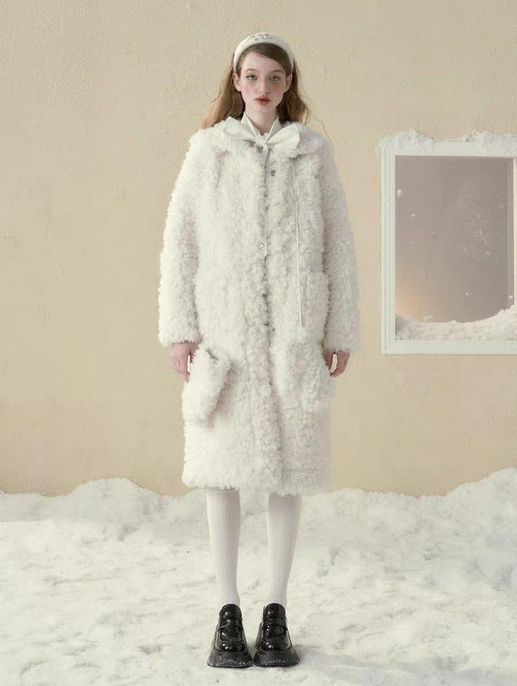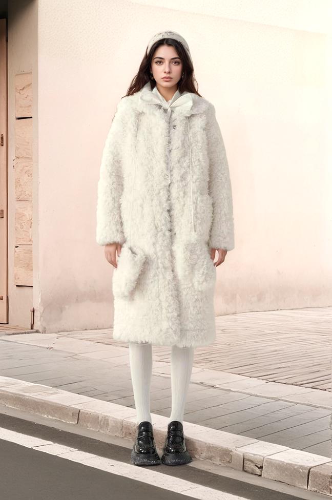 A Woman In A White Fur Coat Stands On A City Sidewalk