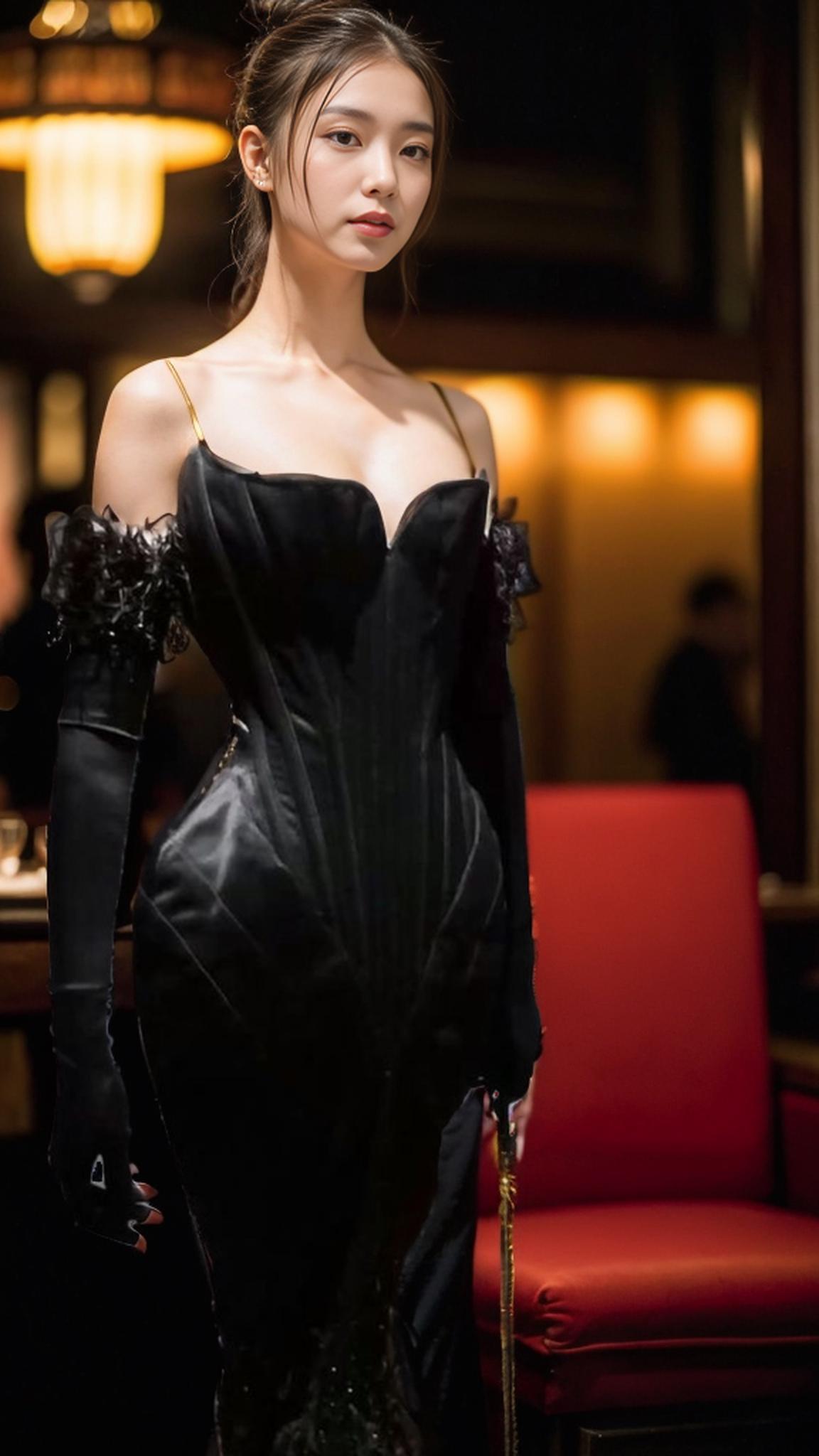 A Woman In An Elegant Black Dress Stands In A Dimly Lit Sophisticated Setting With Red Seating And Warm Lighting