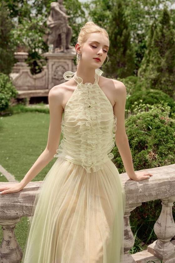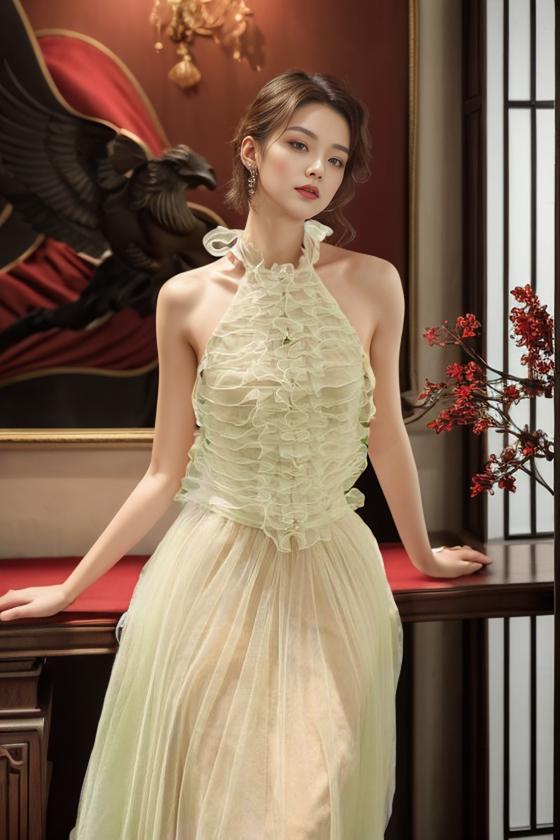 A Woman In An Elegant Light Green Dress Poses Gracefully In A Refined Ornately Decorated Room
