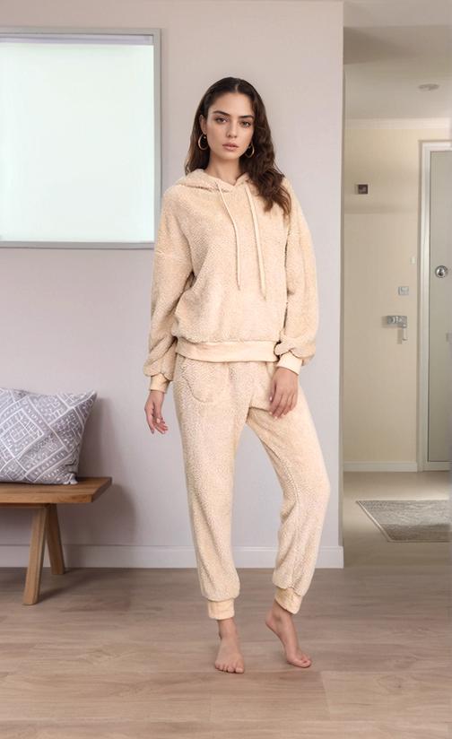 A Woman In Cozy Loungewear Stands Barefoot In A Modern Minimalist Living Room