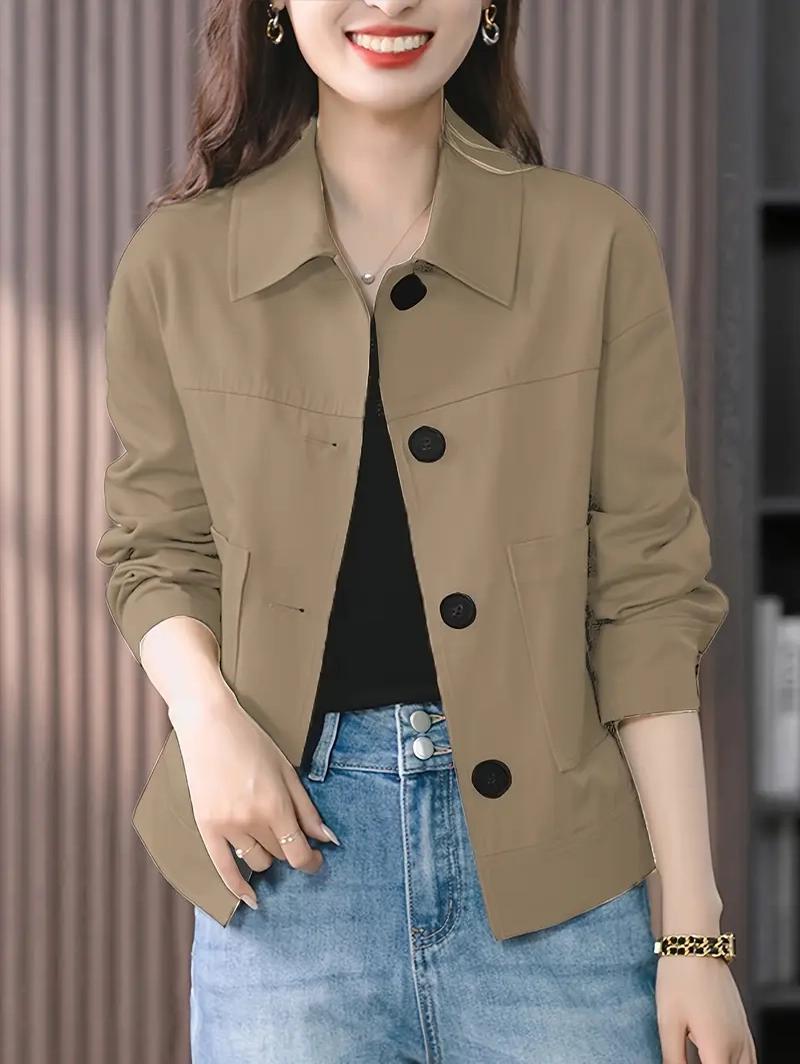 A Woman Is Dressed In A Casual Outfit Featuring A Tan Button-Up Jacket Black Top And Blue Jeans Standing Against A Plain White Background