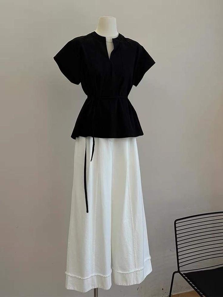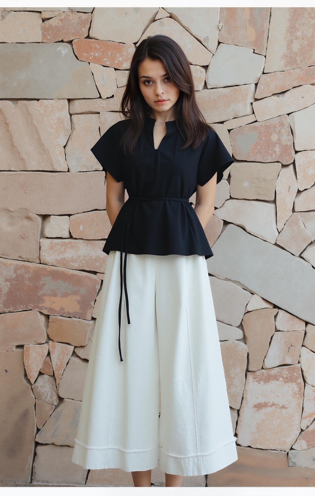 A Woman Is Standing Against A Textured Stone Wall Wearing A Black Top And White Wide-Leg Pants