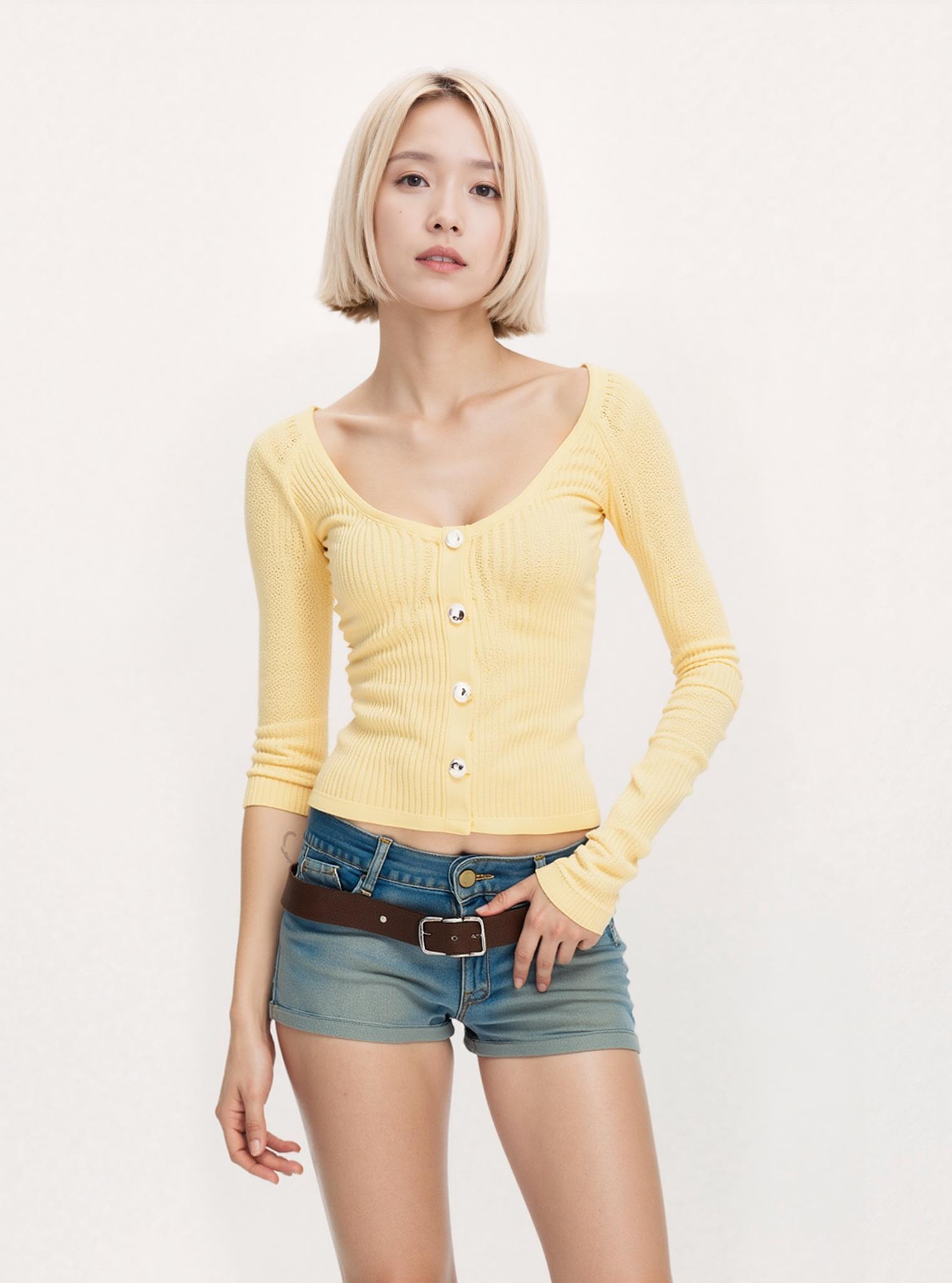 A Woman Poses Confidently In A Casual Outfit Featuring A Yellow Top And Denim Shorts Against A Plain White Background