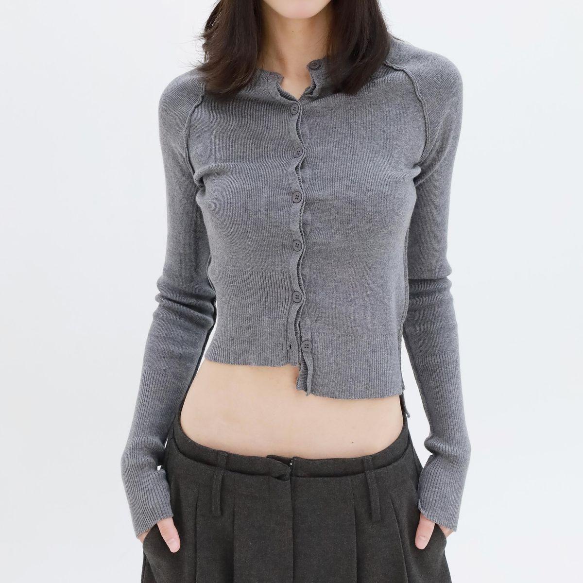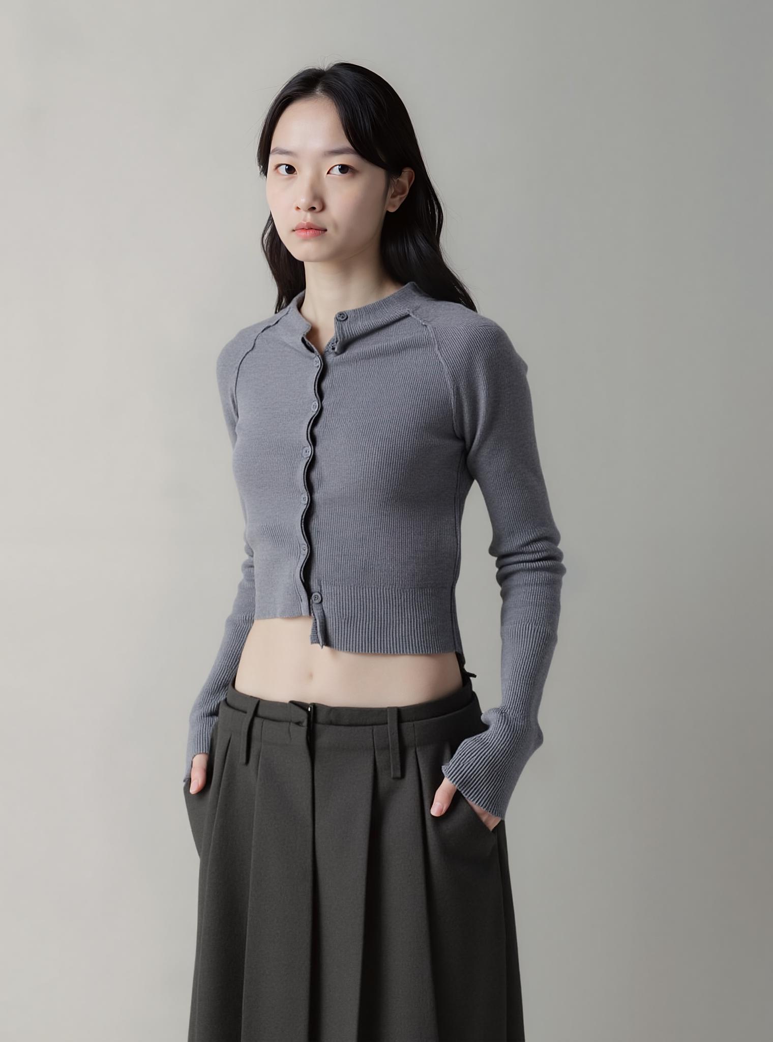 A Woman Poses In A Minimalist Studio Setting Showcasing A Stylish Cropped Cardigan And Pleated Trousers