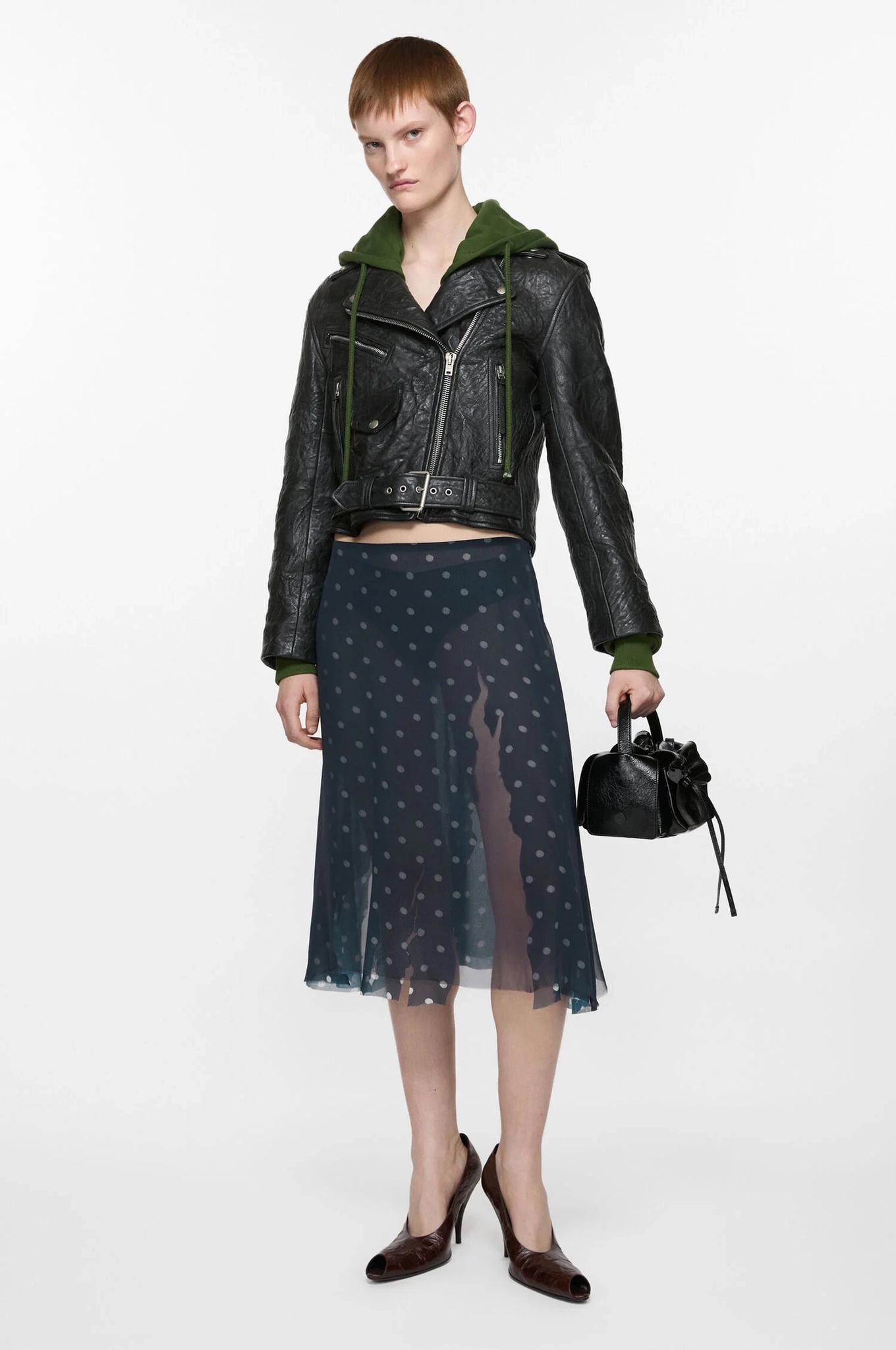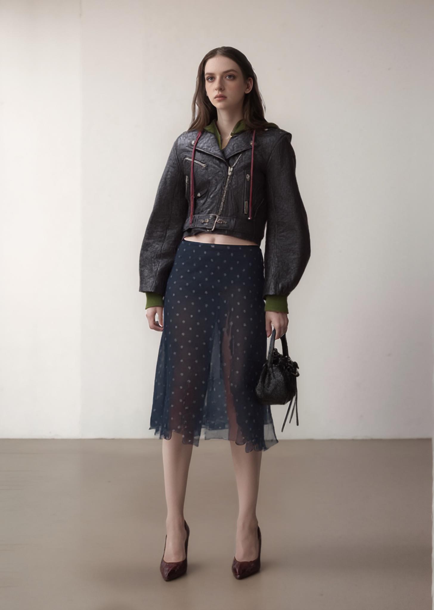 A Woman Showcases A Chic Outfit With A Leather Jacket And A Sheer Polka Dot Skirt Complemented By Classic Pumps And A Trendy Handbag Against A Neutral Background