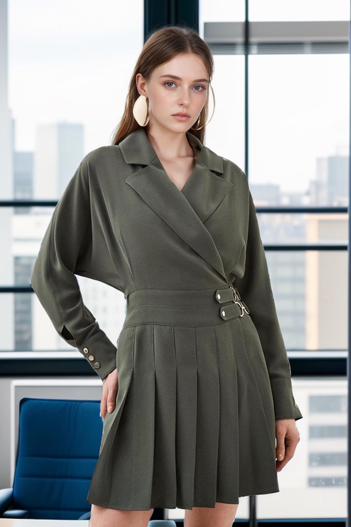 A Woman Showcases A Stylish Olive-Green Dress With A Pleated Skirt In A Modern Office Setting