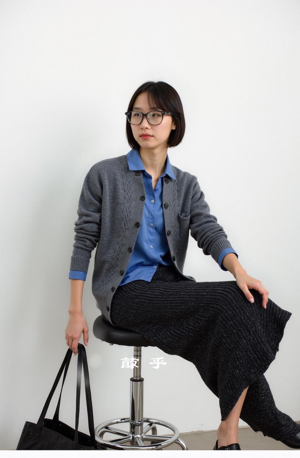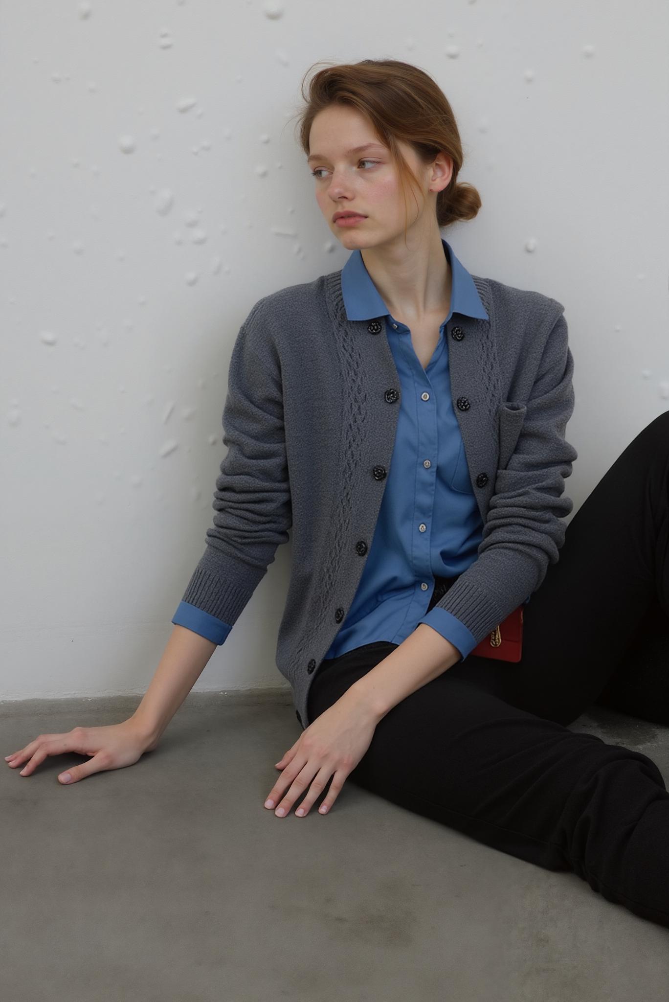 A Woman Sits Casually Against A Minimalist White Wall Dressed In A Blue Shirt Gray Cardigan And Black Pants