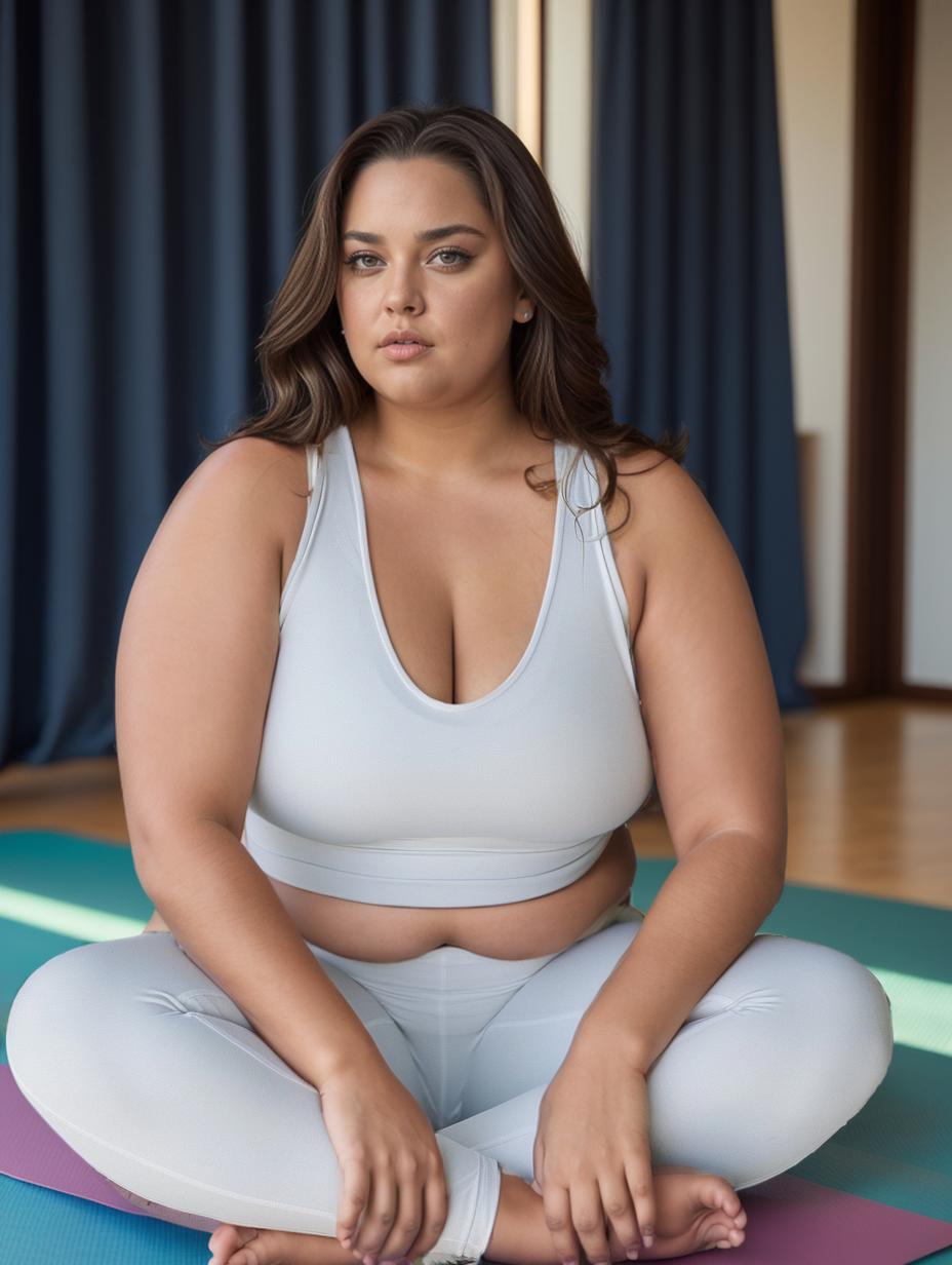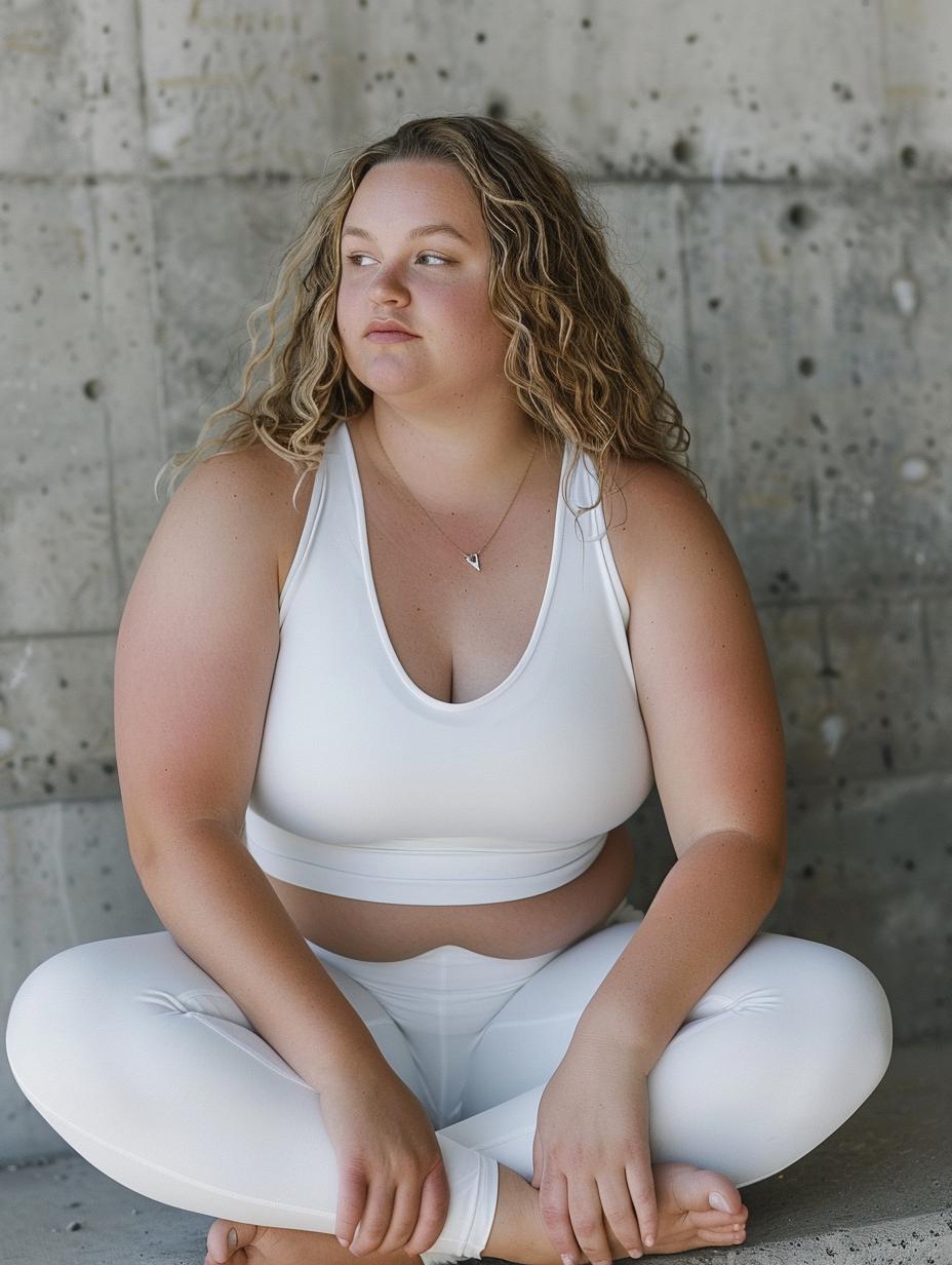 一个大码模特,坐在瑜伽垫上,背景是空旷的空间,室内
