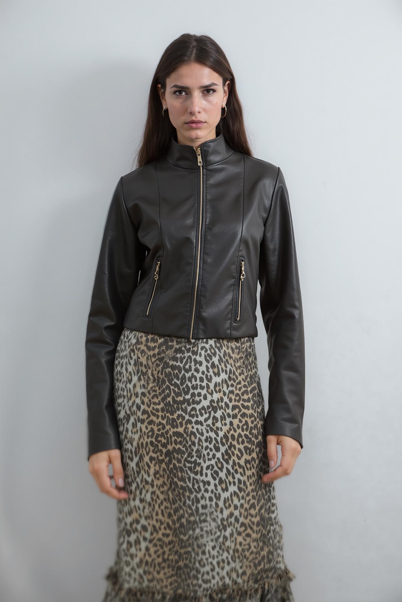 A Woman Stands Against A Plain Wall Showcasing A Stylish Outfit Featuring A Black Leather Jacket And A Leopard-Print Skirt