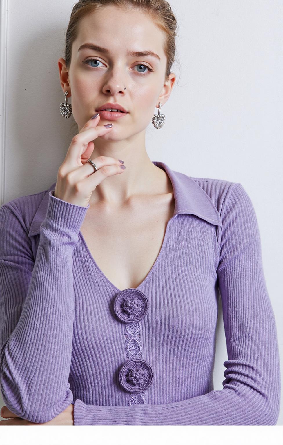A Woman Stands Confidently Against A Marble Wall Showcasing A Stylish Purple Top And White Pants