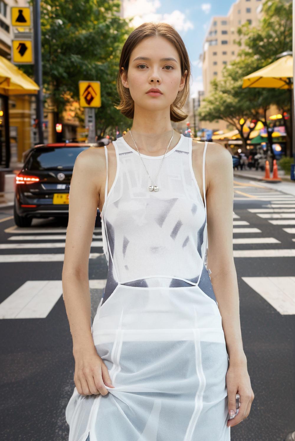 A Woman Stands Confidently In The Middle Of A Bustling City Street Showcasing Her Stylish White Outfit