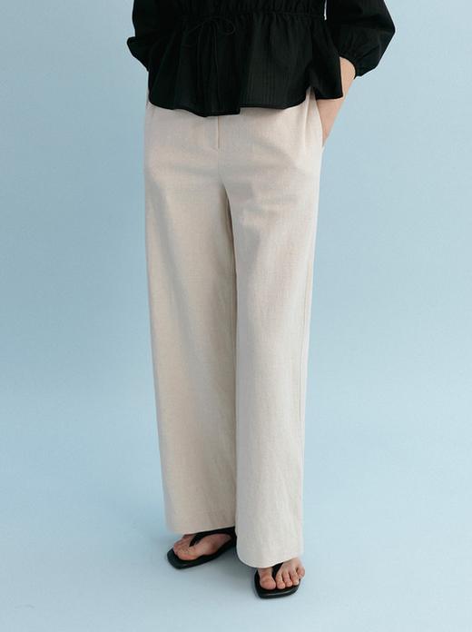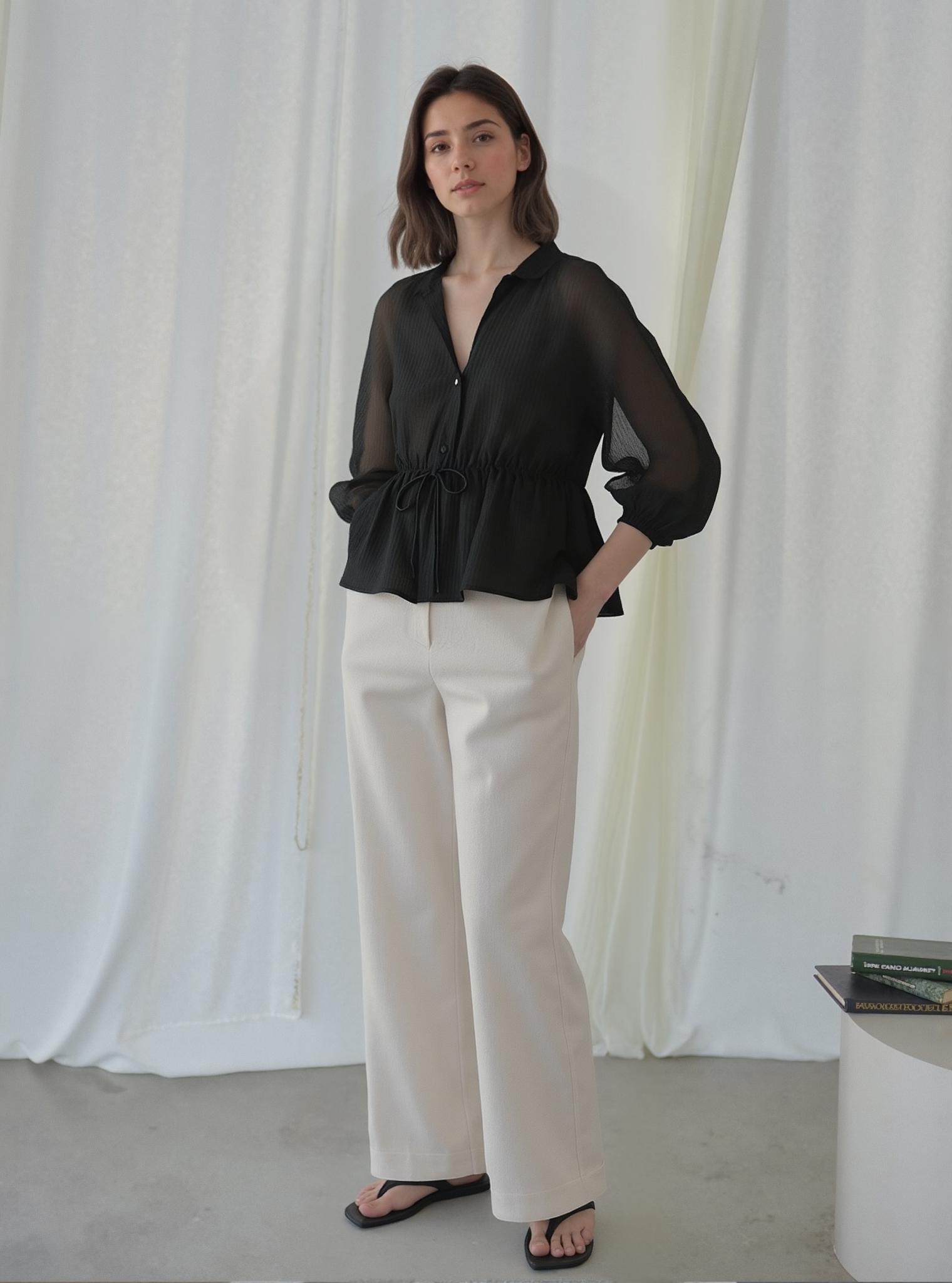 A Woman Stands Gracefully In A Minimalist Indoor Setting Wearing A Chic Black Blouse And White Trousers