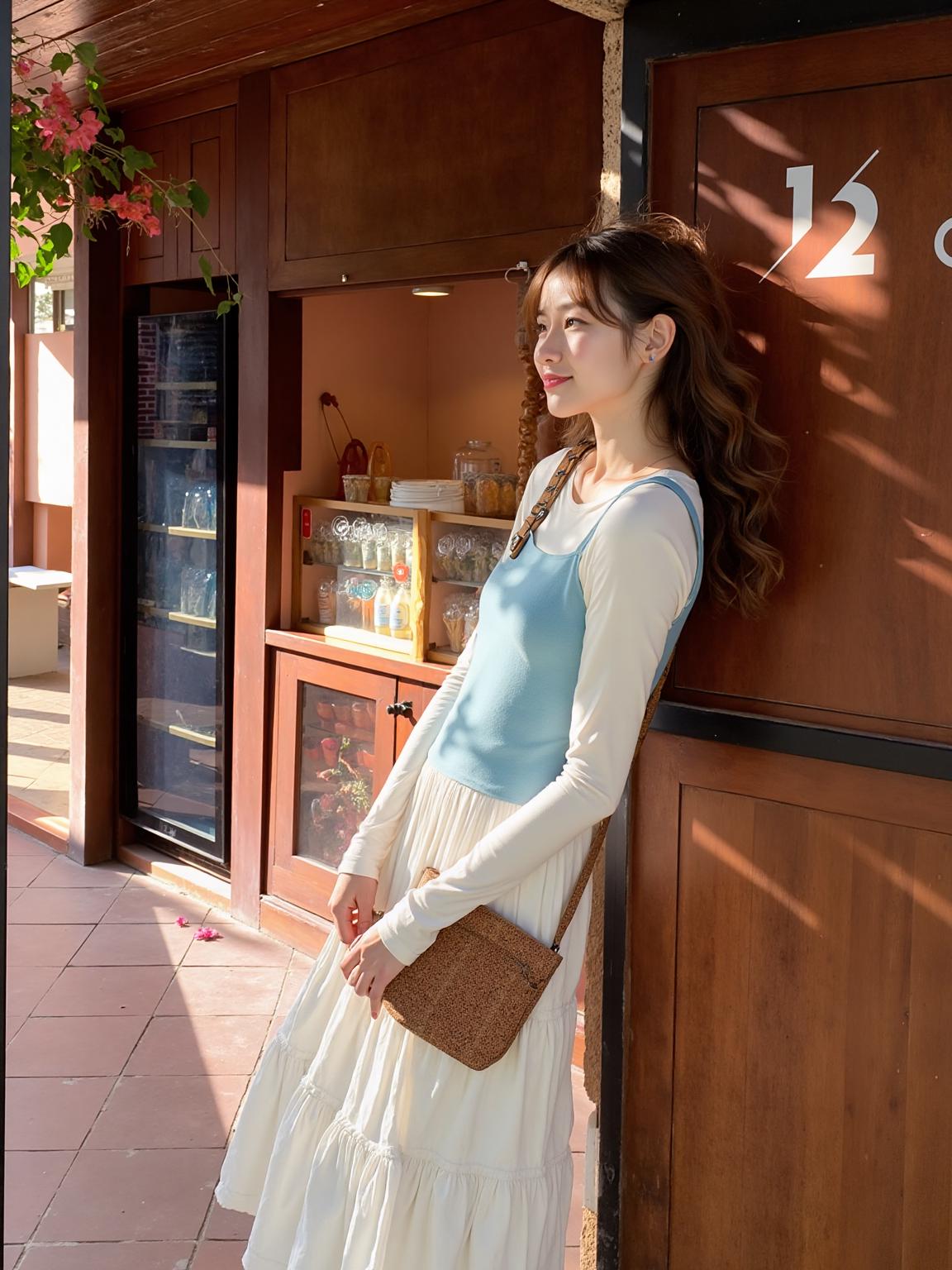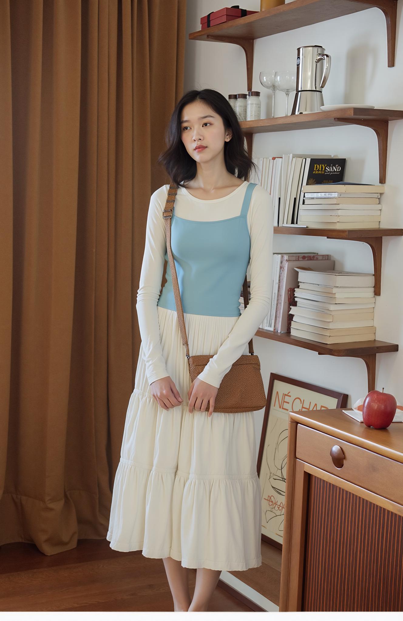 A Woman Stands In A Cozy Book-Filled Room Wearing A Stylish Outfit With A Woven Handbag