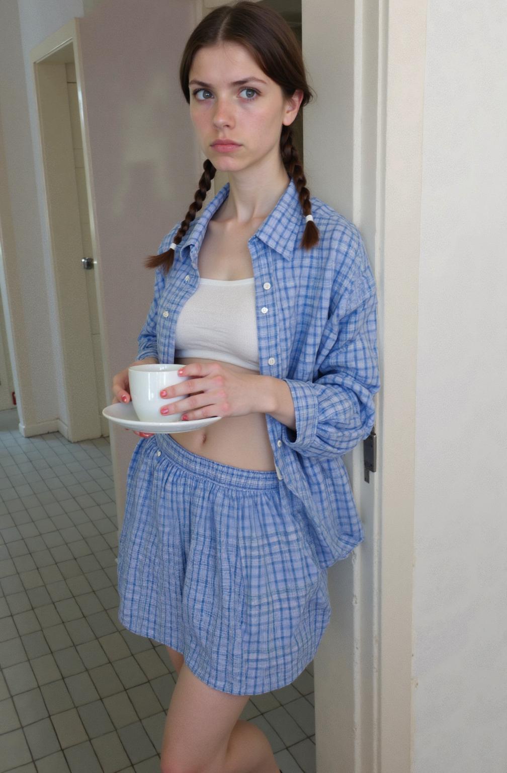 A Woman Stands In A Cozy Indoor Setting Wearing A Matching Blue Checkered Outfit And Holding A White Accessory
