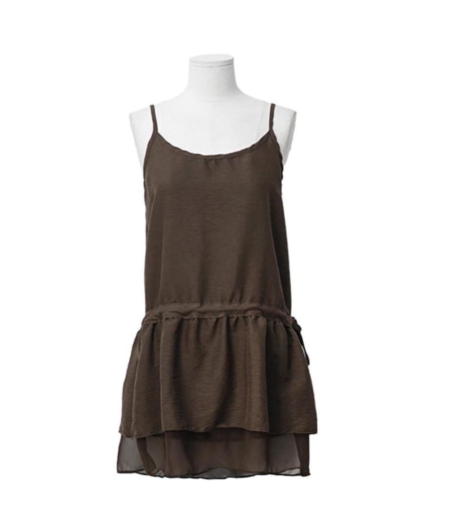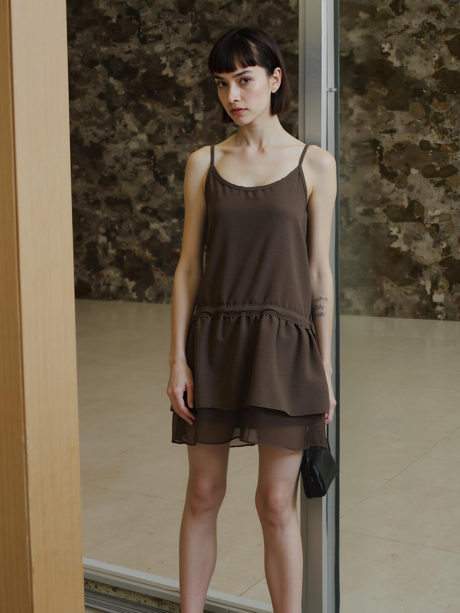 A Woman Stands In A Minimalist Indoor Setting Wearing A Brown Dress And Holding A Small Black Clutch