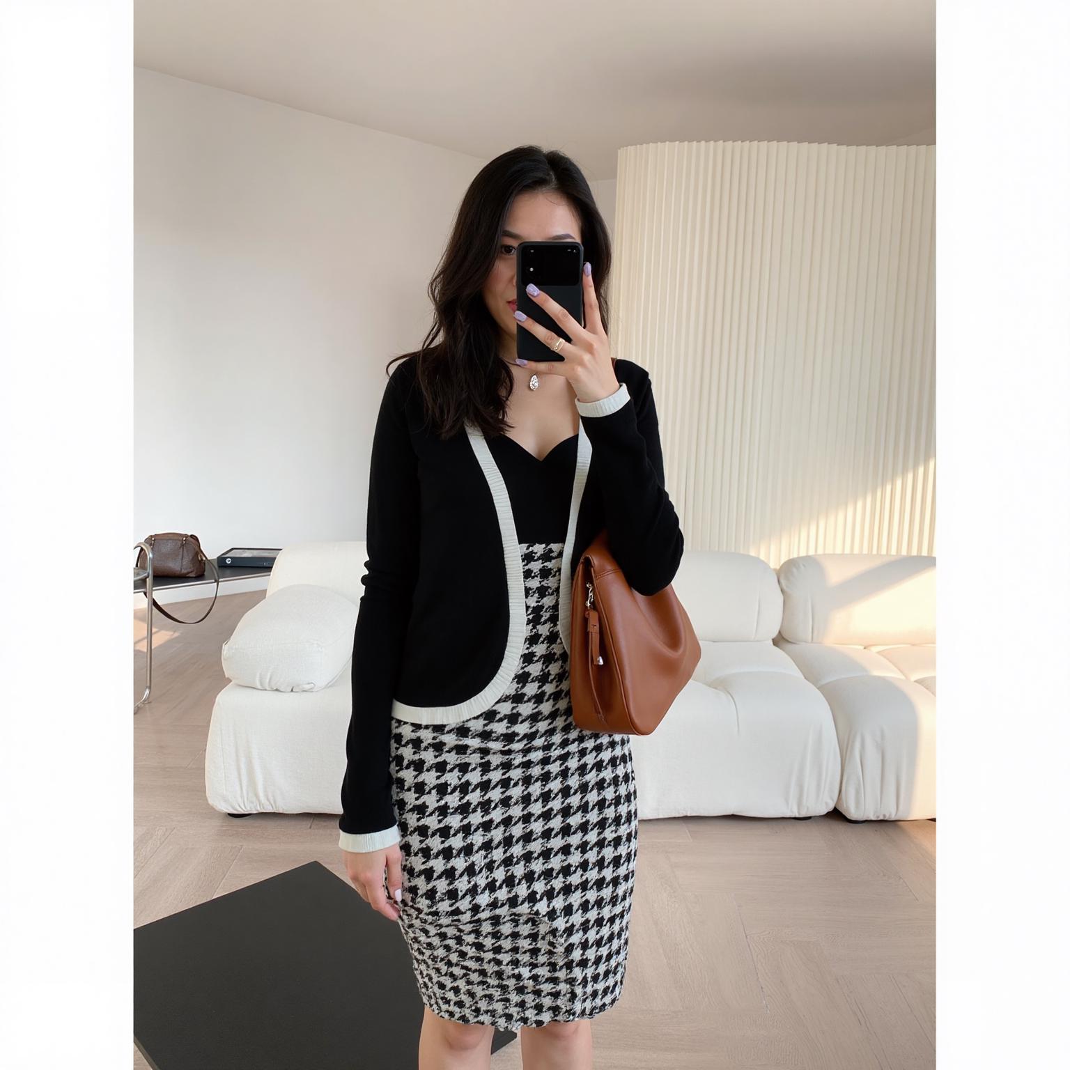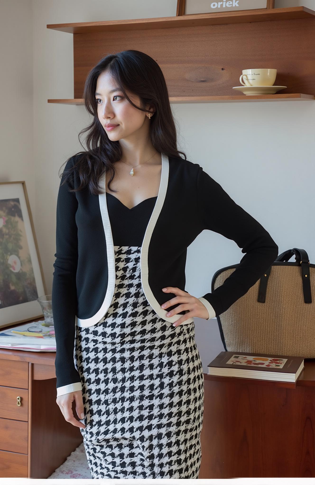A Woman Stands In A Stylish Outfit Featuring A Houndstooth Skirt And Black Cardigan Posed In A Cozy Well-Decorated Indoor Setting
