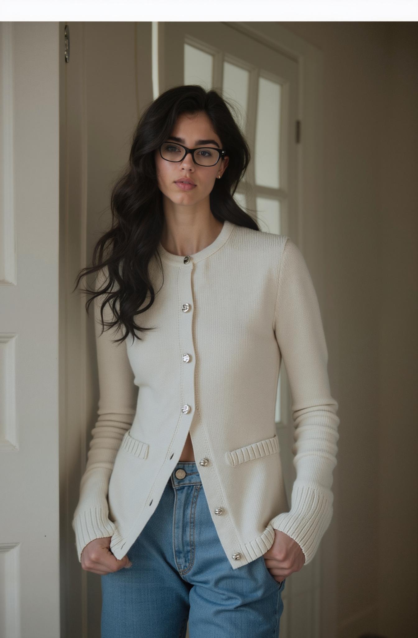 A Woman Stands Indoors Near A White Door Wearing A Cream-Colored Cardigan And Blue Jeans