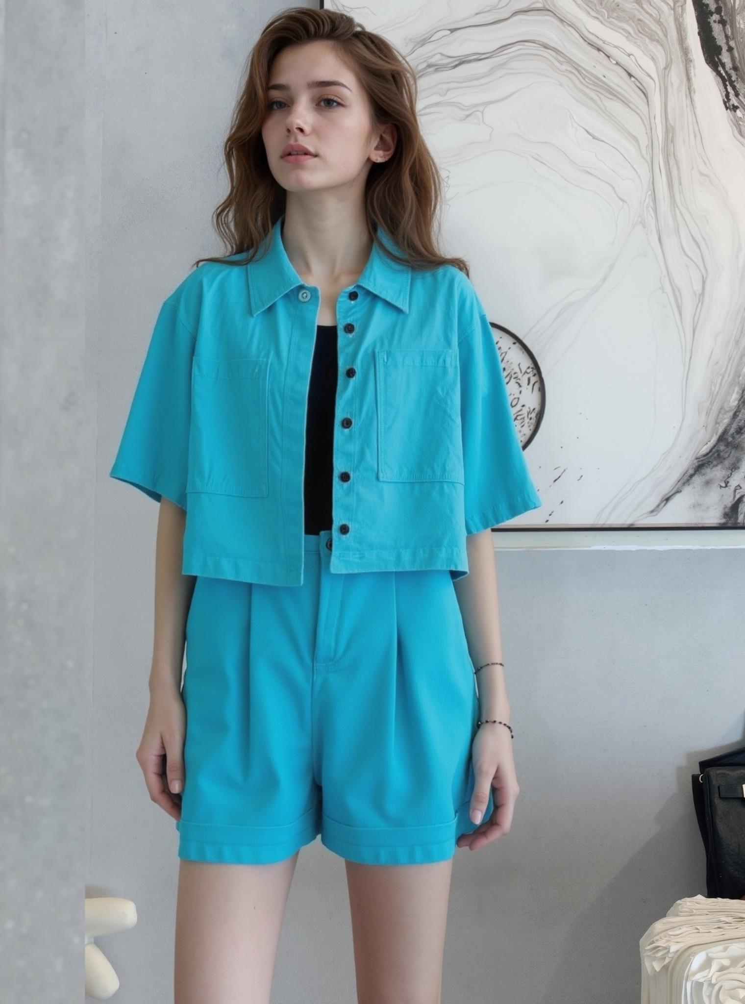 A Woman Stands Indoors Wearing A Vibrant Blue Outfit Against A Modern Art-Inspired Backdrop