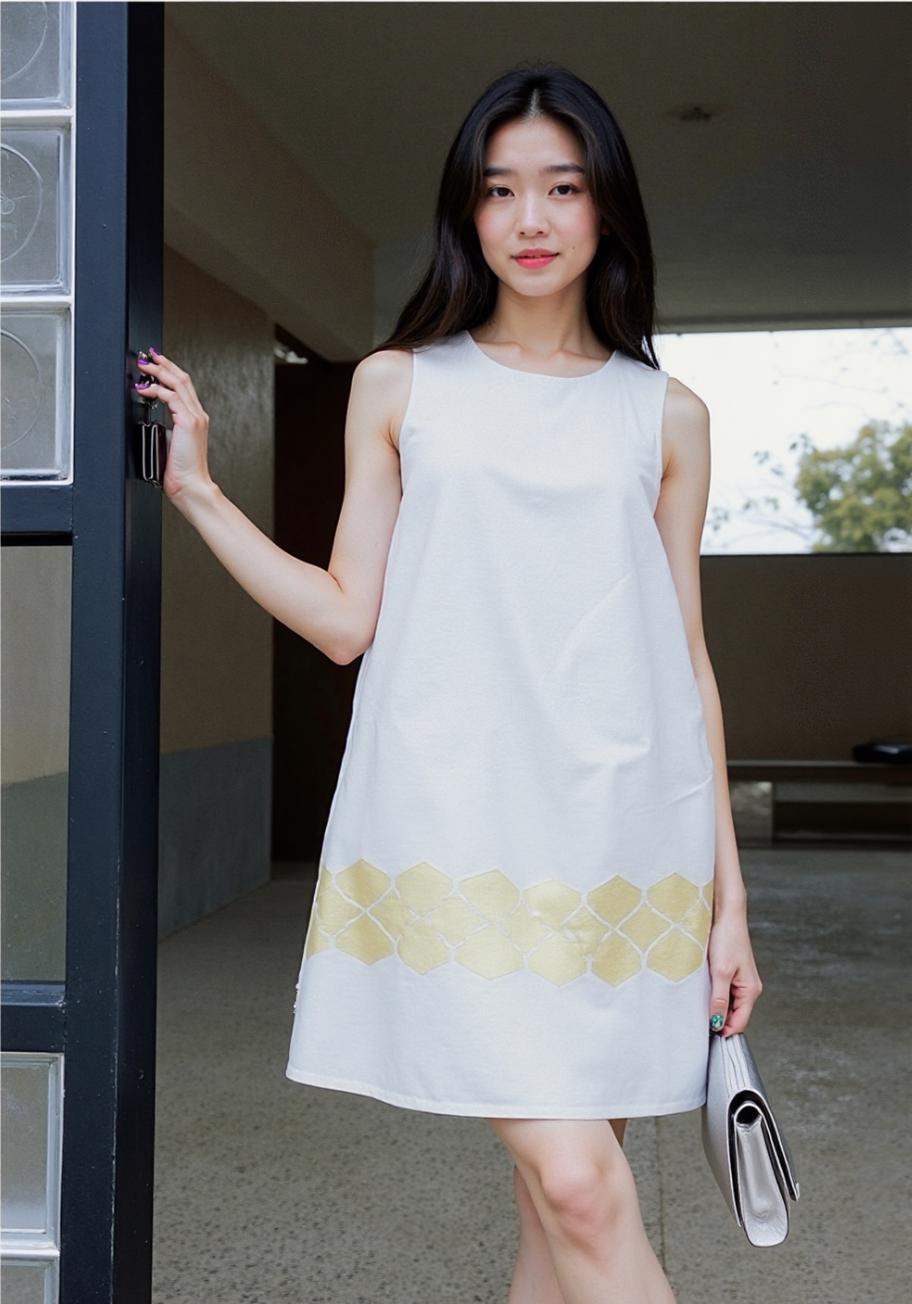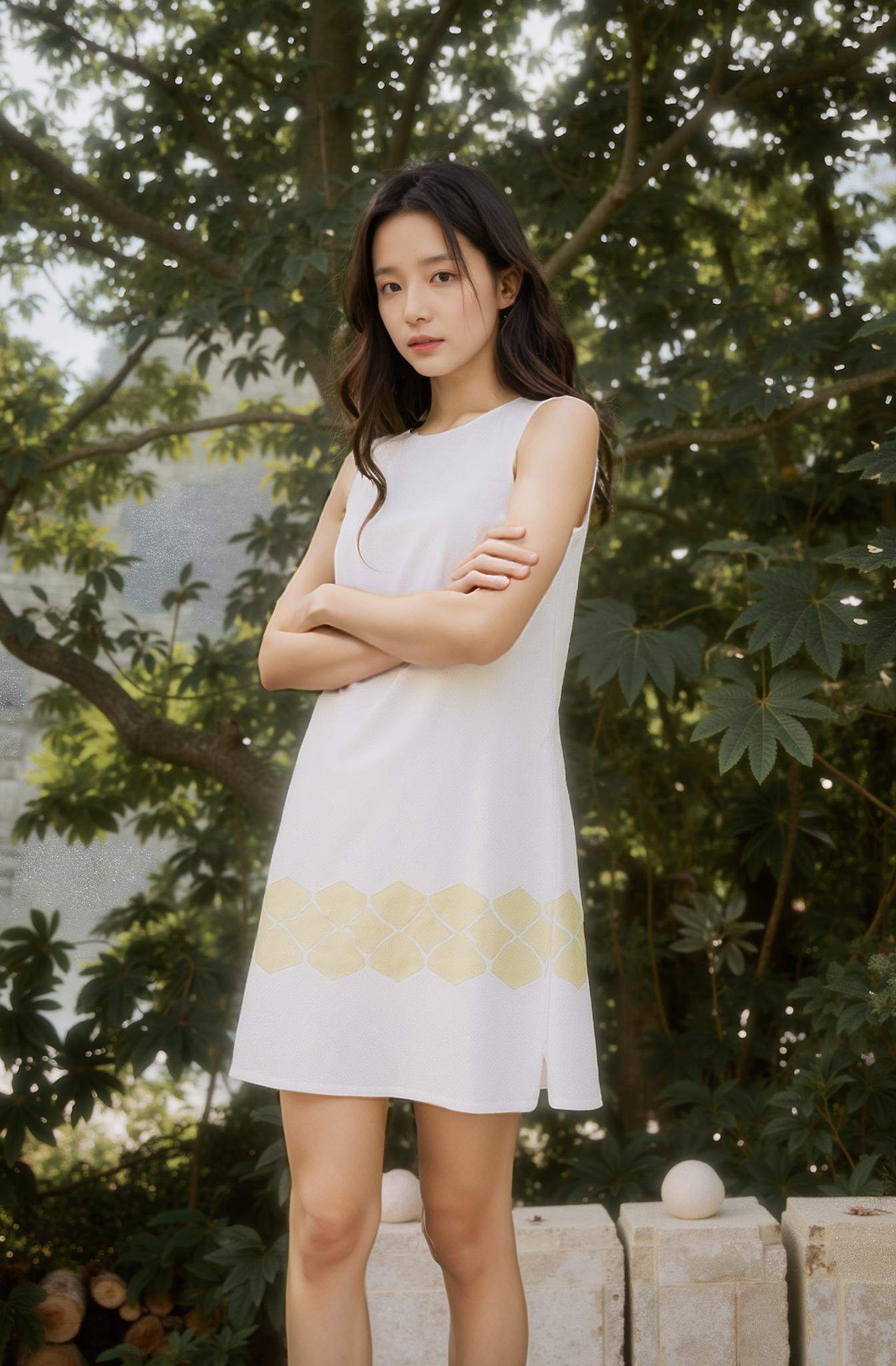 A Woman Stands Outdoors In A Serene Garden Setting Wearing A White Dress With Yellow Geometric Accents