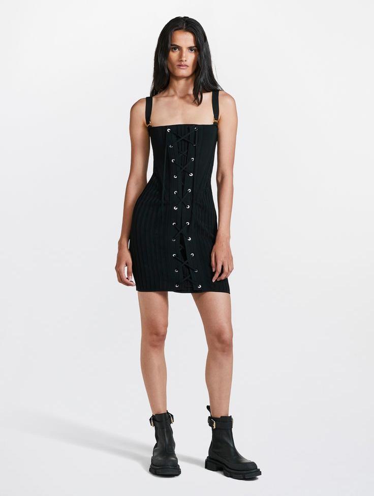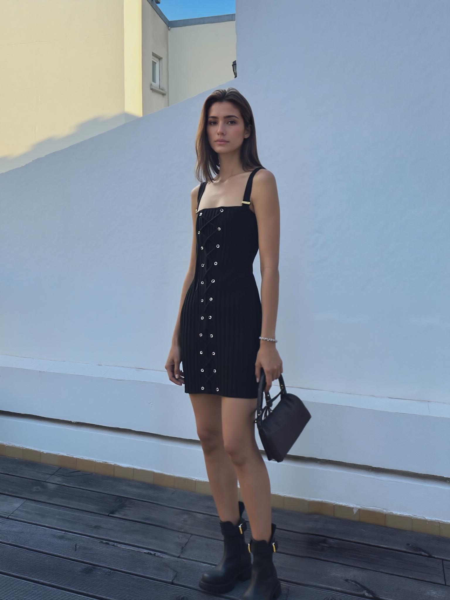 A Woman Stands Outdoors On A Wooden Deck Wearing A Stylish Black Dress And Boots While Holding A Small Handbag