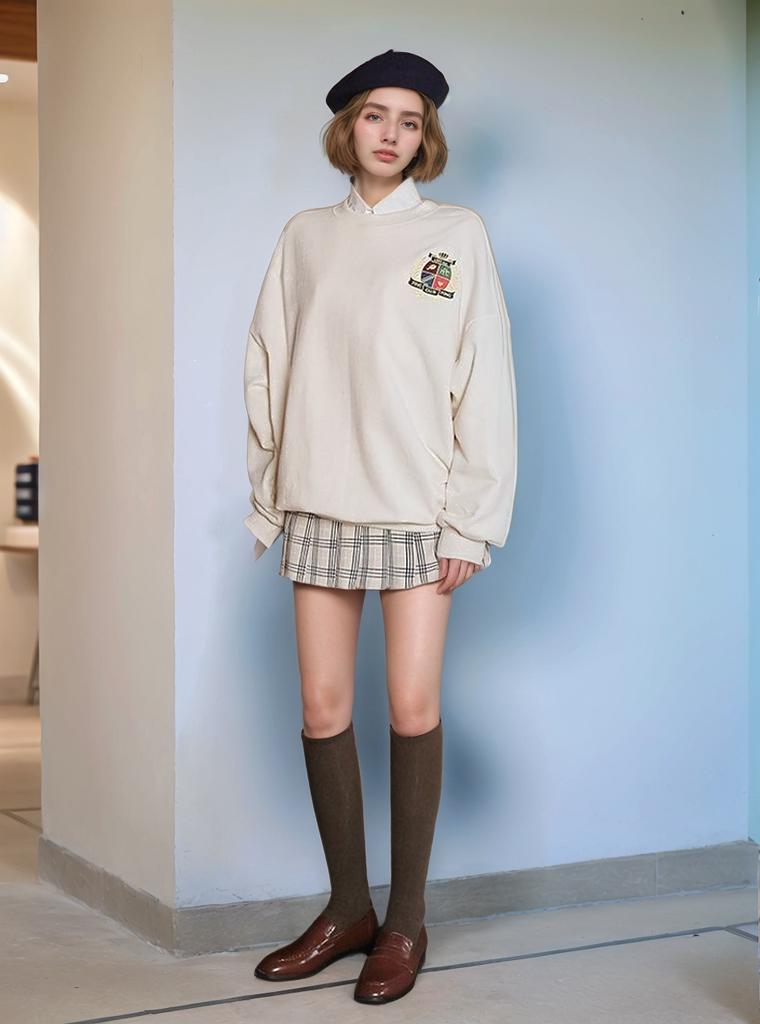 A Woman Stands Stylishly In A Casual Outfit Featuring An Oversized Sweater And Plaid Skirt Posing In A Modern Indoor Setting