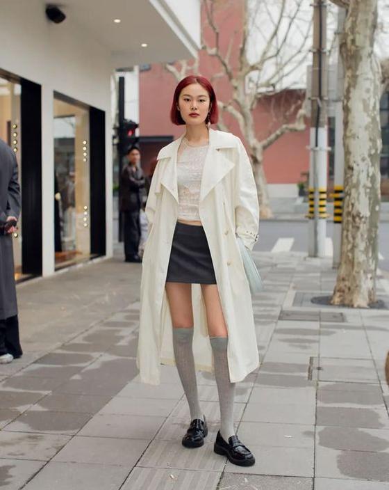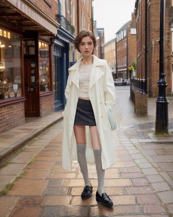 A Woman Stands Stylishly On A Cobblestone Street In An Urban Setting Wearing A White Trench Coat And Knee-High Socks