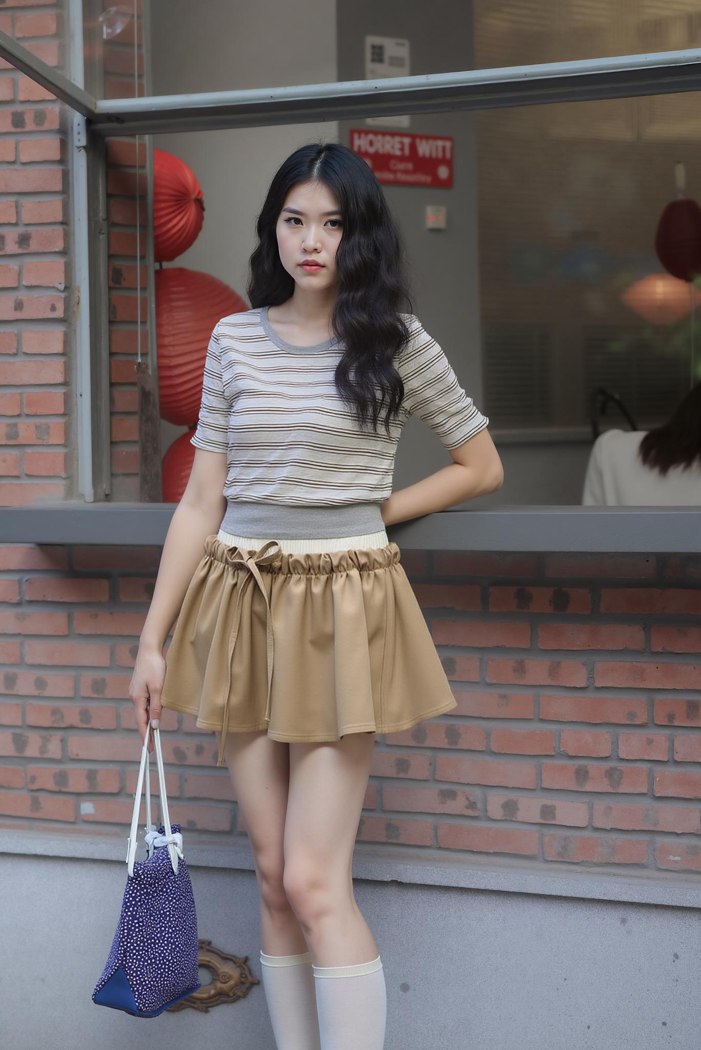A Woman Stands Stylishly Outdoors Next To A Brick Wall Holding A Patterned Bag In A Casual Urban Setting