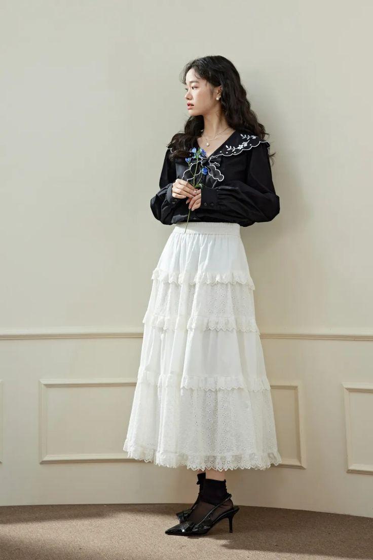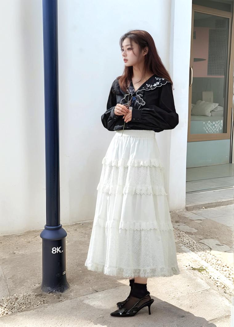A Woman Wearing A Black Blouse And White Tiered Skirt Stands Outdoors Next To A Blue Pole
