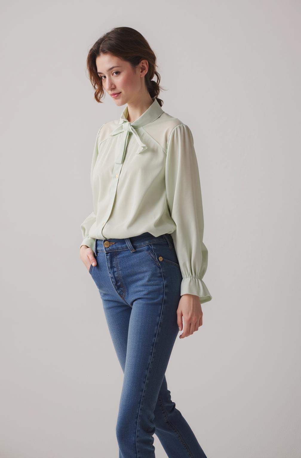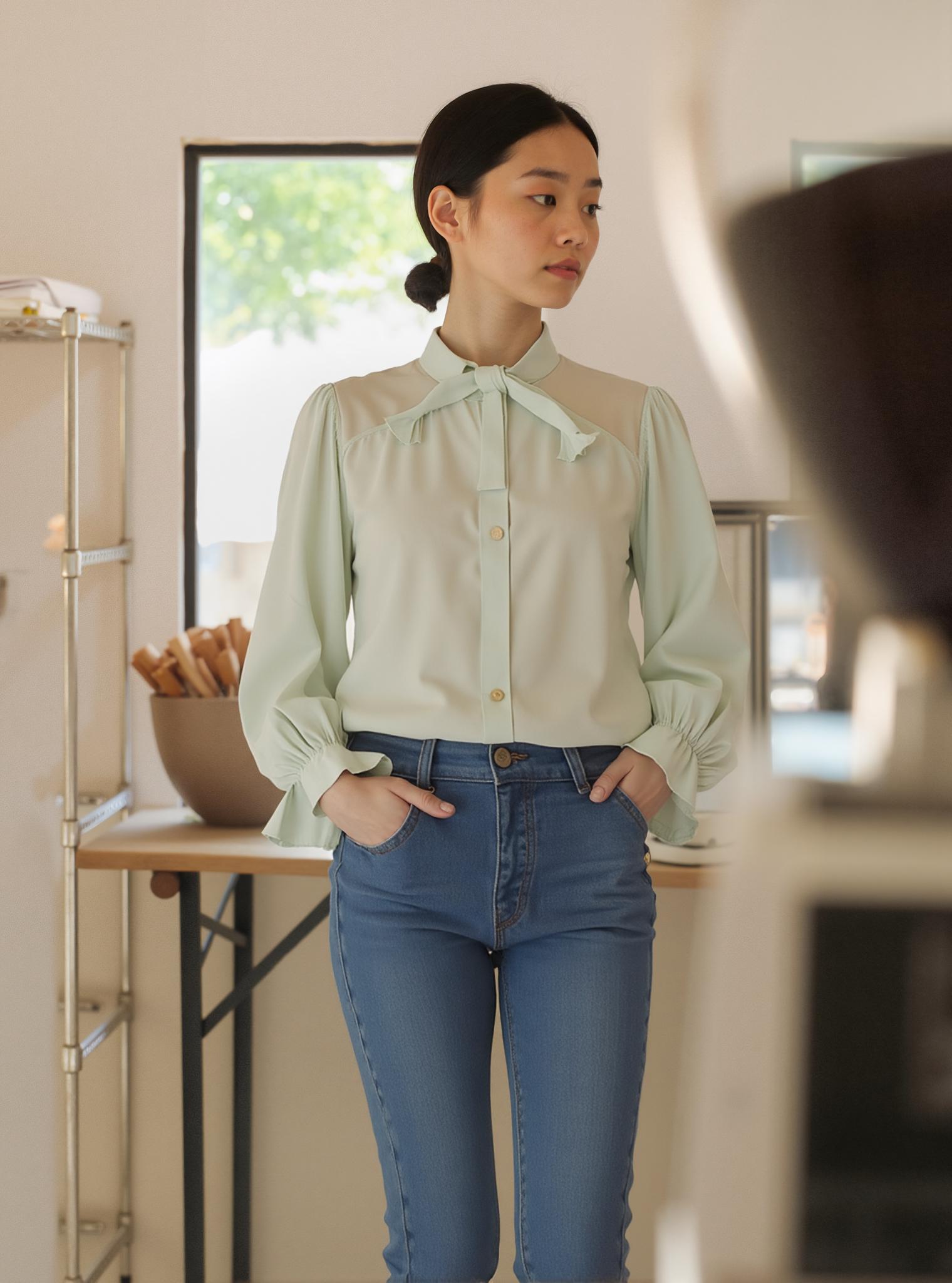 A Woman Wearing A Light Green Blouse And Blue Jeans Stands In A Cozy Well-Lit Room With Shelves And A Table In The Background