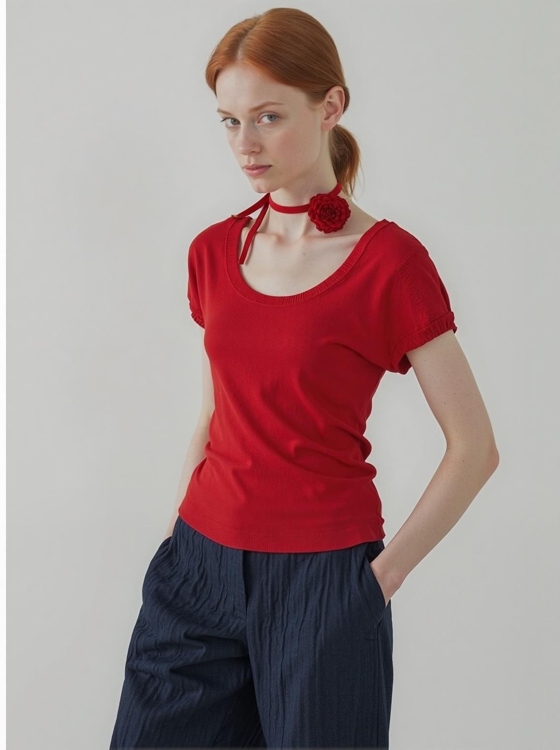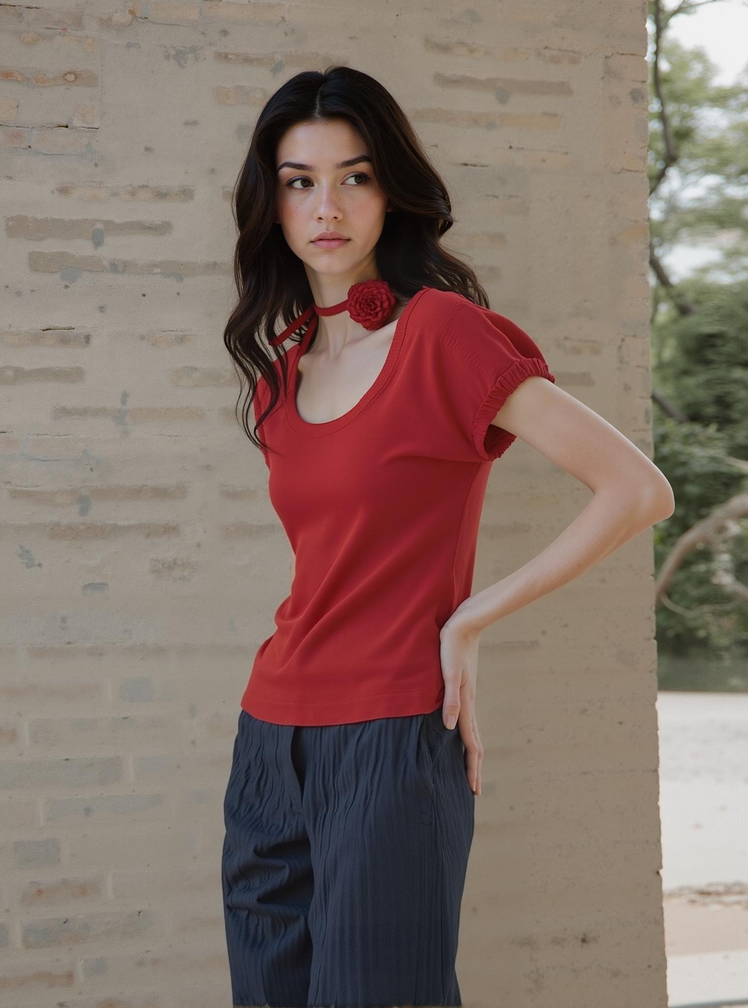 A Woman Wearing A Red Top And Navy Pants Poses Outdoors Against A Brick Wall With Trees In The Background